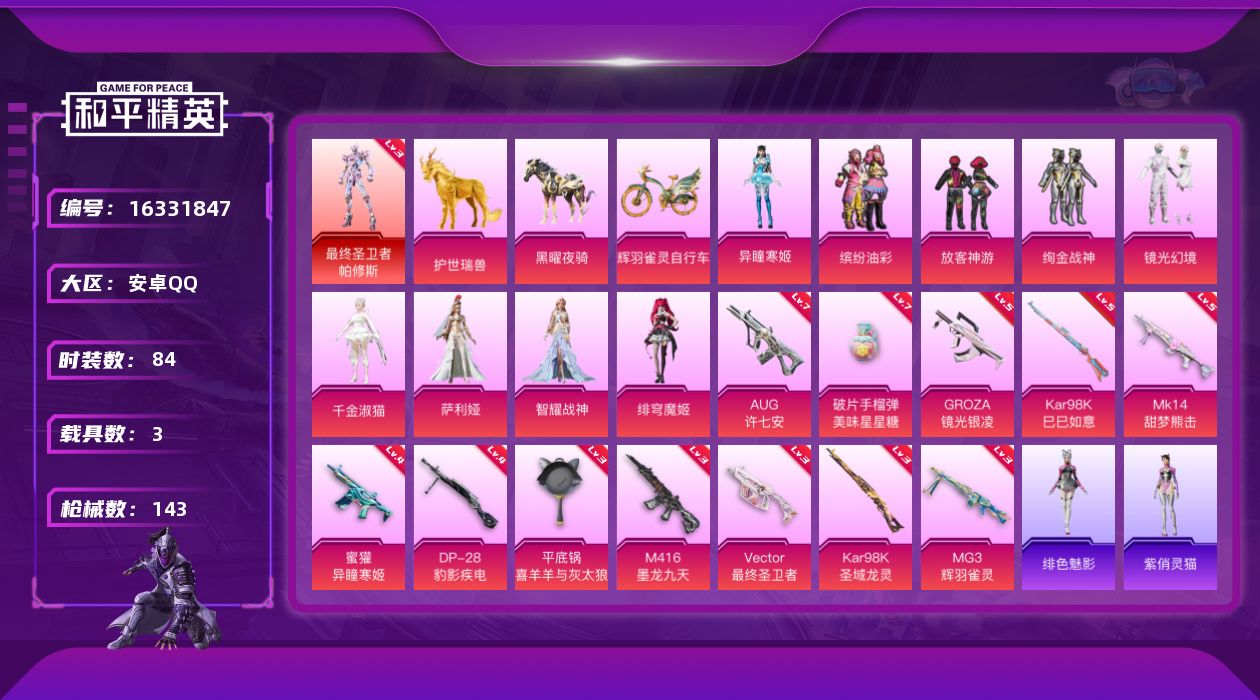 - PX_2096416- 安卓手Q-13王牌印记-11粉装-7特效枪-2载具-51347热力值-114套装-166枪皮-2卓越印记-1传奇印记 【11粉装】,小叽联名款,第五大道,星穹咏叹调,严莉莉,飒粉甜心,小可学妹,美雪,圣光天使,寒光使者,心之回忆,美琪 【7特效枪】AKM-绿萝繁花-5级 SCAR-L-锦绣绵绵-5级 M416-心之恋语-5级 Kar98K-巳巳如意-4级 UMP45-量子极