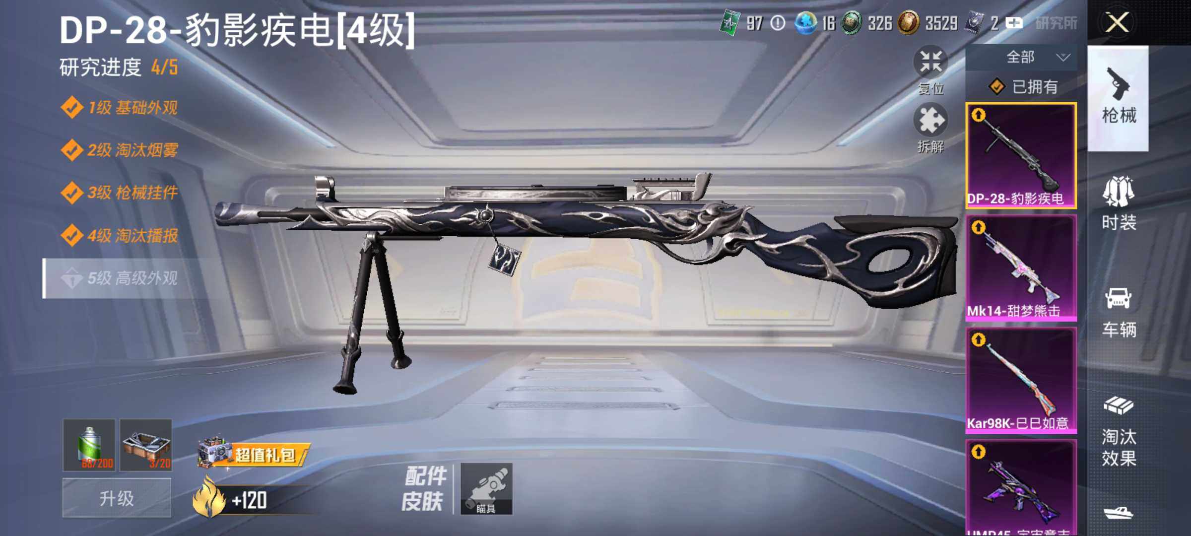 【粉色枪皮等级】:SCAR-L-锦绣绵绵(五级),M416-电玩时刻(五级),GROZA-巴啦啦小魔仙(七级),Famas-初号机 觉醒Ver.(六级),UMP45-量子极限(五级),UMP45-宇宙意志(三级),P90-金丰海韵(五级),Kar98K-巳巳如意(五级),Mk14-甜梦熊击(五级),M200-梦海之灵(三级),DP-28-豹影疾电(四级)
