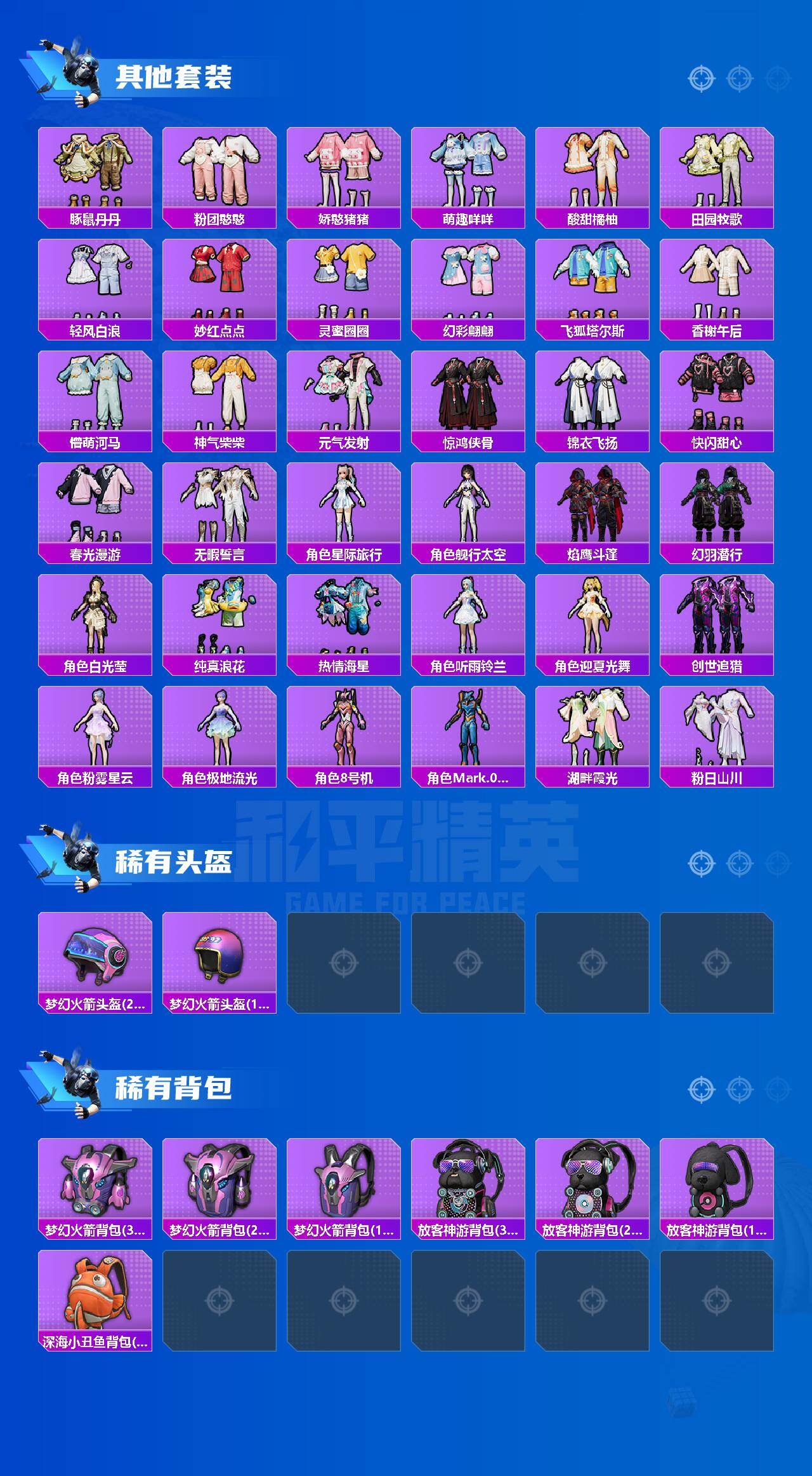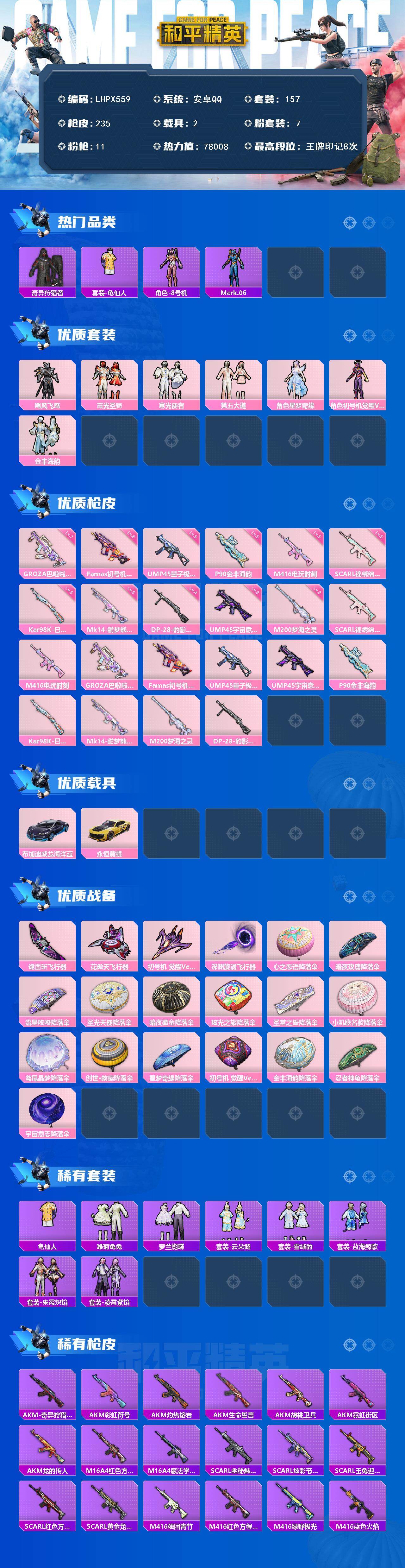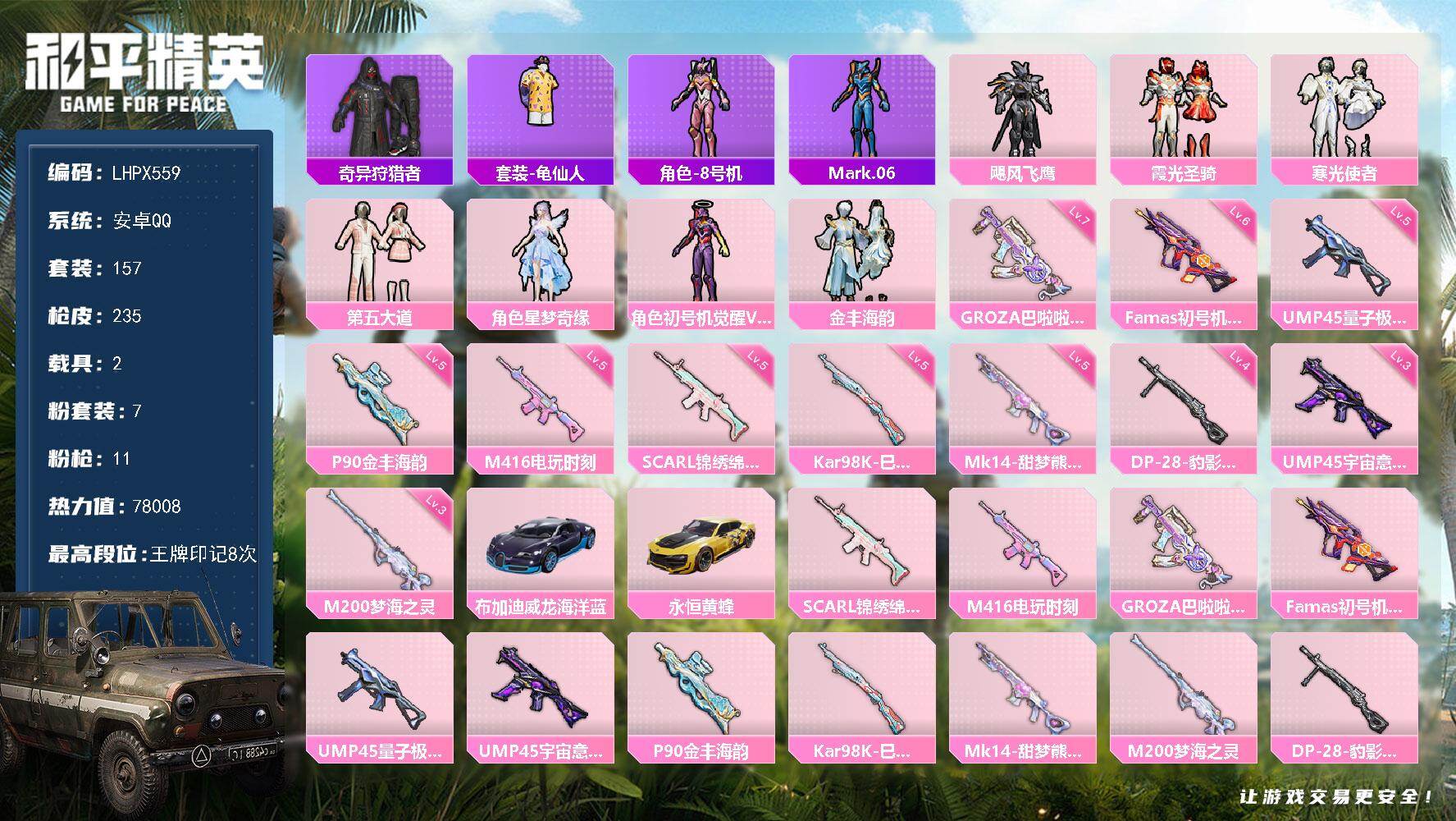 [16333490]【特价出售/店主推荐】安卓 手Q-7粉装-11特效枪-2载具-4粉色飞行器-78008热力值-8王牌印记-157套装-235枪皮 【热门品类】:套装-奇异狩猎者,套装-龟仙人,角色-8号机,角色-Mark.06 【粉色套装】:粉装-飓风飞鹰,粉装-霞光圣骑,粉装-寒光使者,粉装-第五大道,角色-星梦奇缘,角色-初号机 觉醒Ver.,粉装-金丰海韵 【粉色枪皮等级】:SCAR-L-锦绣绵绵(五级),M416-电玩时刻(五级),GROZA-巴啦啦小魔仙(七级),Famas-初号机 觉醒Ver.(六级),UMP45-量子极限(五级),UMP45-宇宙意志(三级),P90-金丰海韵(五级),Kar98K-巳巳如意(五级),Mk14-甜梦熊击(五级),M200-梦海之灵(三级),DP-28-豹影疾电(四级) 【粉色载具】:布加迪威龙(海洋蓝),永恒黄蜂 【粉色枪皮】:SCAR-L-锦绣绵绵,M416-电玩时刻,GROZA-巴啦啦小魔仙,Famas-初号机 觉醒Ver.,UMP45-量子极限,UMP45-宇宙意志,P90-金丰海韵,Kar98K-巳巳如意,Mk14-甜梦熊击,M200-梦海之灵,DP-28-豹影疾电 【粉色飞行器】:诡面斩飞行器,花傲天飞行器,初号机 觉醒Ver.飞行器,深渊漩涡飞行器 【粉色降落伞】:心之恋语降落伞,暗夜玫瑰降落伞,流星咚咚降落伞,圣光天使降落伞,暗夜鎏金降落伞,炫光之旅降落伞,圣堂之誓降落伞,小叽联名款降落伞,鸢尾晶梦降落伞,创世·救赎降落伞,星梦奇缘降落伞,初号机 觉醒Ver.降落伞,金丰海韵降落伞,忍者神龟降落伞,宇宙意志降落伞,炫彩糖果降落伞 【稀有套装】:套装-龟仙人,套装-雏菊兔兔,套装-萝兰蝴蝶,套装-云朵鹅,套装-雪绒豹,套装-蓝海鲸歌,套装-朱霞炽焰,套装-凌霄紫焰 【稀有枪皮】:AKM-奇异狩猎者,AKM-彩虹符号,AKM-灼热熔岩,AKM-生命誓言,AKM-胡桃卫兵,AKM-霓虹街区,AKM-龙的传人,M16A4-红色方程式,M16A4-魔法学院,SCAR-L-幽秘魅影,SCAR-L-炫彩节奏,SCAR-L-玉兔迎春,SCAR-L-红色方程式,SCAR-L-黄金龙骨,M416-糯团青竹,M416-红色方程式,M416-绿野极光,M416-蓝色火焰,GROZA-异彩先驱,GROZA-彩虹符号,GROZA-懵萌河马,GROZ