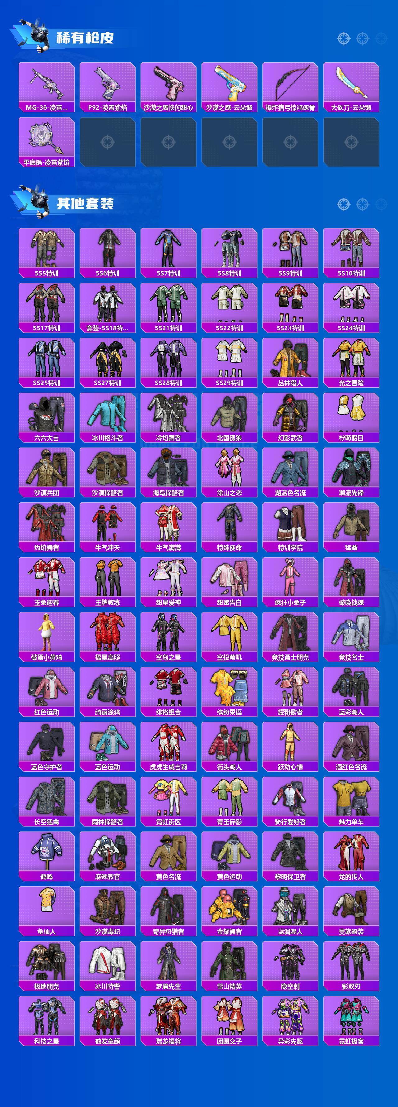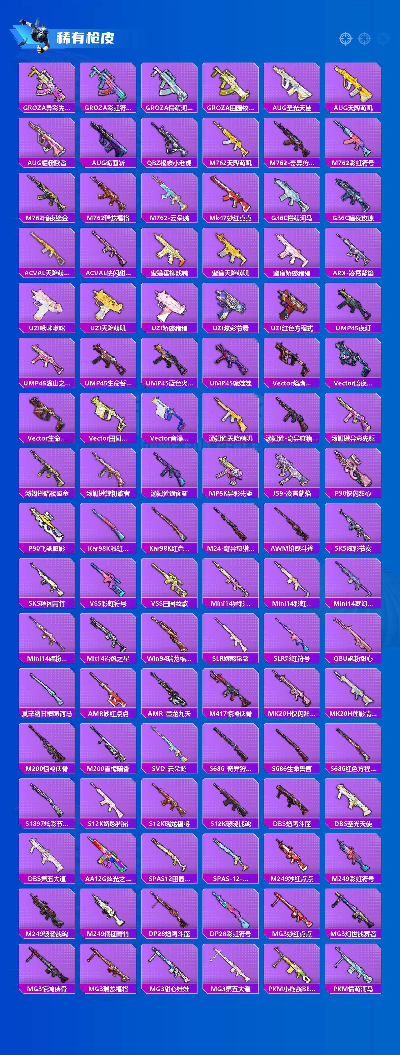 【稀有枪皮】:AKM-奇异狩猎者,AKM-彩虹符号,AKM-灼热熔岩,AKM-生命誓言,AKM-胡桃卫兵,AKM-霓虹街区,AKM-龙的传人,M16A4-红色方程式,M16A4-魔法学院,SCAR-L-幽秘魅影,SCAR-L-炫彩节奏,SCAR-L-玉兔迎春,SCAR-L-红色方程式,SCAR-L-黄金龙骨,M416-糯团青竹,M416-红色方程式,M416-绿野极光,M416-蓝色火焰,GROZA-异彩先驱,GROZA-彩虹符号,GROZA-懵萌河马,GROZ
