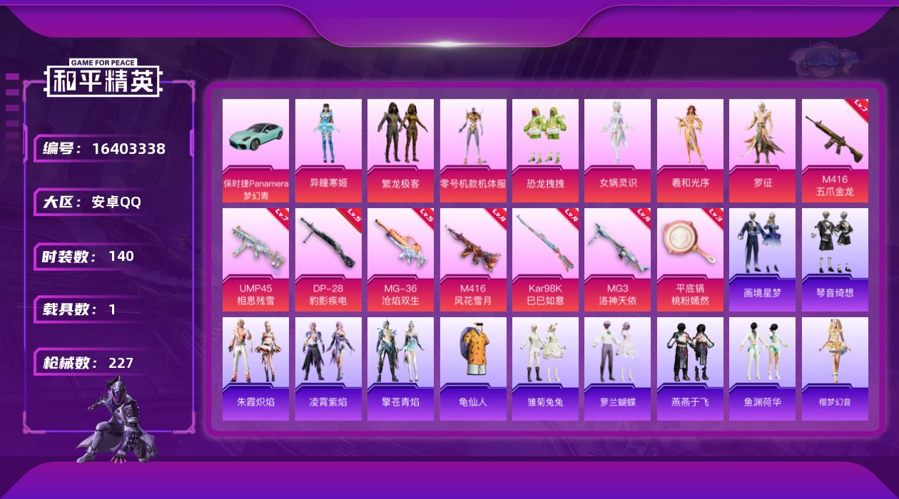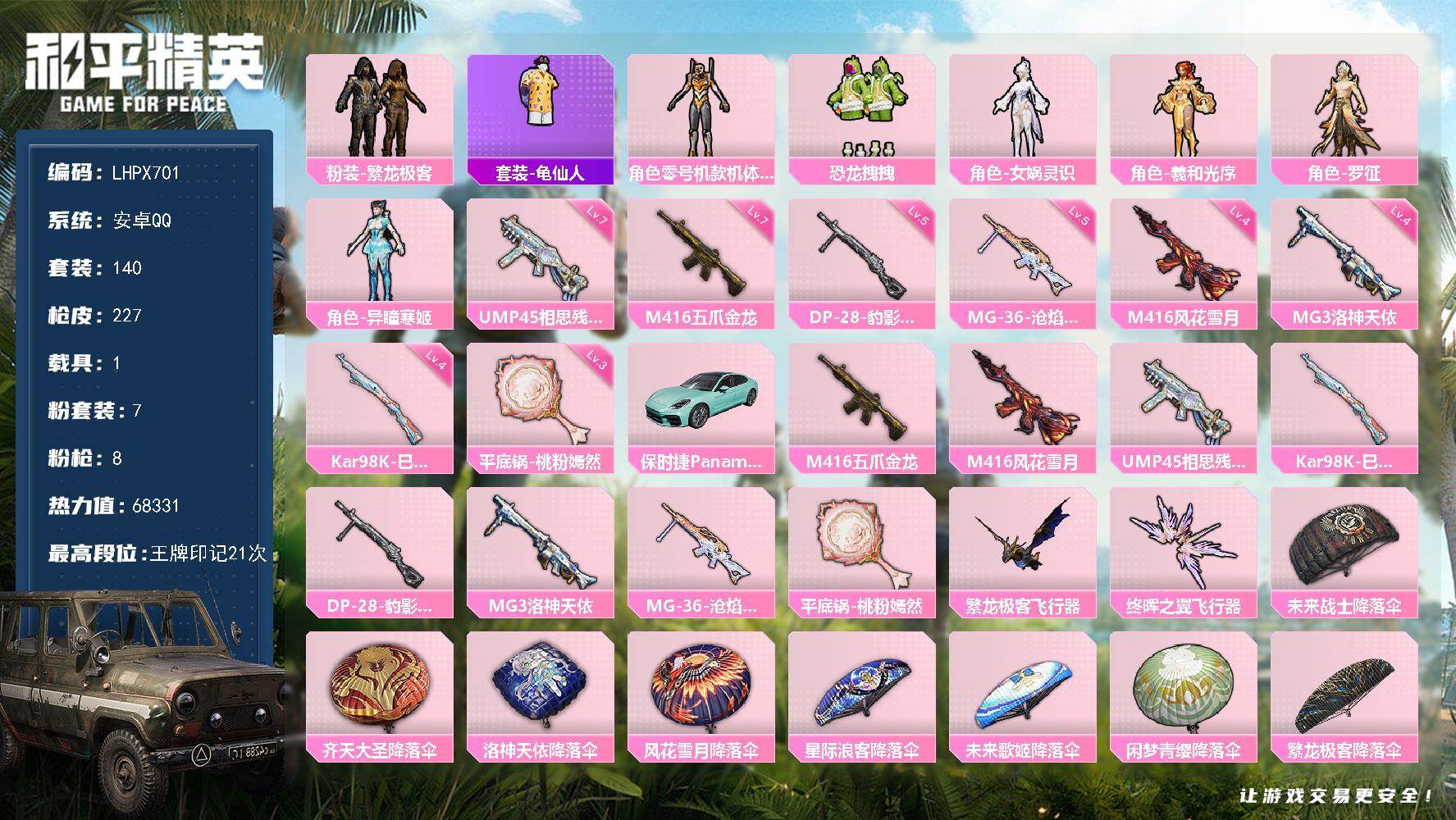 [16403338]【特价出售/店主推荐】安卓 手Q-7粉装-8特效枪-1载具-2粉色飞行器-6.8w热力值-21王牌印记-140套装-227枪皮 【热门品类】:粉装-繁龙极客,套装-龟仙人 【粉色套装】:角色-零号机款机体服,粉装-恐龙拽拽,粉装-繁龙极客,角色-女娲灵识,角色-羲和光序,角色-罗征,角色-异瞳寒姬 【粉色枪皮等级】:M416-五爪金龙(七级),M416-风花雪月(四级),UMP45-相思残雪(七级),Kar98K-巳巳如意(四级),DP-28-豹影疾电(五级),MG3-洛神天依(四级),MG-36-沧焰双生(五级),平底锅-桃粉嫣然(三级) 【粉色载具】:保时捷Panamera(梦幻青) 【粉色枪皮】:M416-五爪金龙,M416-风花雪月,UMP45-相思残雪,Kar98K-巳巳如意,DP-28-豹影疾电,MG3-洛神天依,MG-36-沧焰双生,平底锅-桃粉嫣然 【粉色飞行器】:繁龙极客飞行器,终晖之翼飞行器 【粉色降落伞】:未来战士降落伞,齐天大圣降落伞,洛神天依降落伞,风花雪月降落伞,星际浪客降落伞,未来歌姬降落伞,闲梦青缨降落伞,繁龙极客降落伞,忍者神龟降落伞,樱桃泡泡降落伞,星穹咏叹调降落伞,最终圣卫者降落伞,冷漠罗丽降落伞 【稀有套装】:套装-龟仙人,套装-雪国风尚,套装-雏菊兔兔,套装-萝兰蝴蝶,套装-燕燕于飞,套装-鱼渊荷华,套装-樱梦幻音,套装-紫幽梦,套装-蓝冰羽,套装-极速光影,套装-云朵鹅,套装-雪绒豹,套装-朱霞炽焰,套装-凌霄紫焰,套装-擎苍青焰,套装-画境星梦,套装-琴音绮想 【稀有枪皮】:AKM-夜灯,AKM-彩虹符号,AKM-破晓战魂,AKM-虎虎生威,AKM-霓虹街区,M16A4-幻世战舞者,M16A4-最终圣卫者,SCAR-L-暗夜玫瑰,SCAR-L-红色方程式,M416-红色方程式,GROZA-异彩先驱,GROZA-彩虹符号,GROZA-恐龙拽拽,GROZA-懵萌河马,GROZA-治愈之星,GROZA-田园牧歌,AUG-青春冒险家,QBZ-洛神天依,QBZ-飞驰魅影,M762-天星战神,M762-天降萌叽,M762-牛气冲天,M762-瑞龙福将,M762-镭射皇者,M762-云朵鹅,Mk47-妙红点点,Mk47-洛神天依,Mk47-青春冒险家,G36C-懵萌河马,G36C-时空追击者,G36C-暗夜玫瑰,G36C-星穹咏叹调