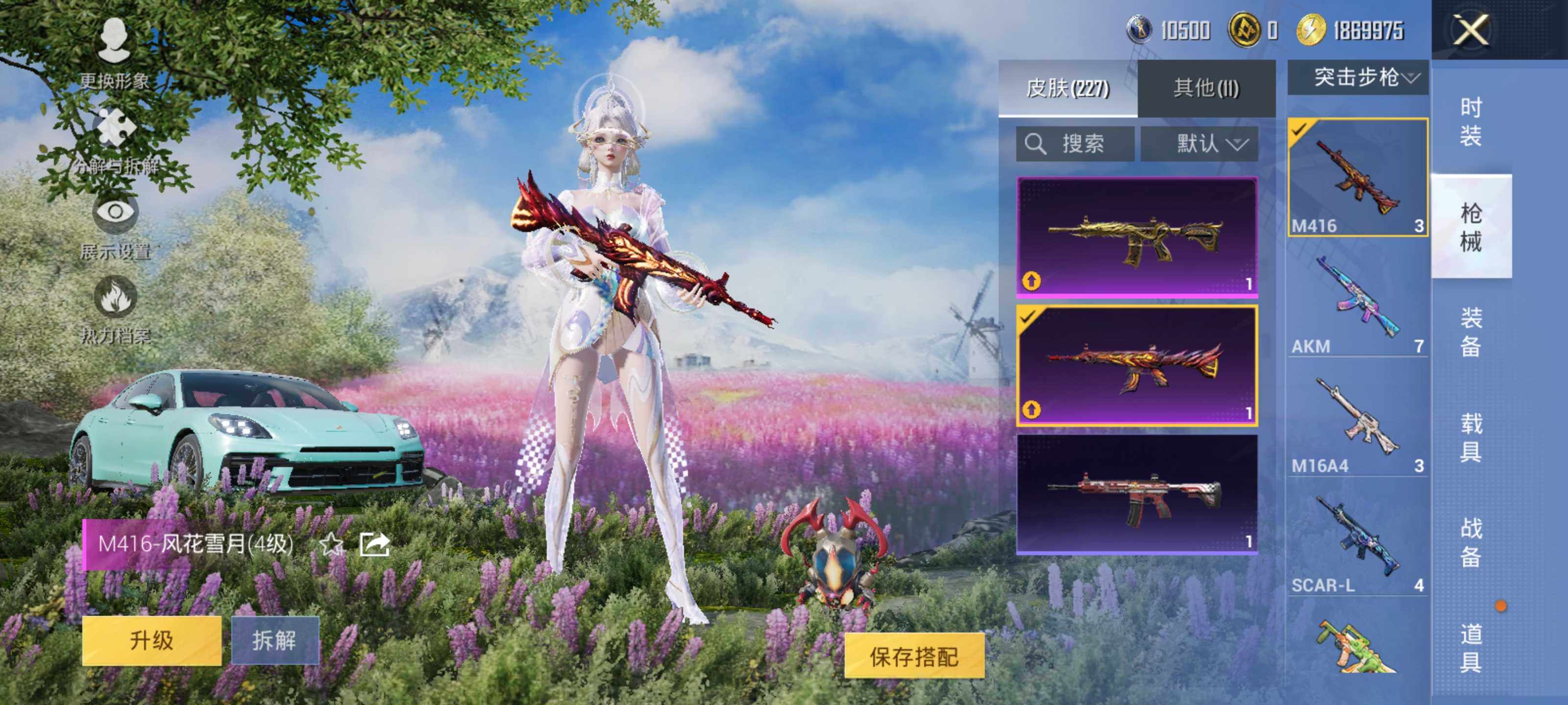 【粉色枪皮等级】:M416-五爪金龙(七级),M416-风花雪月(四级),UMP45-相思残雪(七级),Kar98K-巳巳如意(四级),DP-28-豹影疾电(五级),MG3-洛神天依(四级),MG-36-沧焰双生(五级),平底锅-桃粉嫣然(三级)