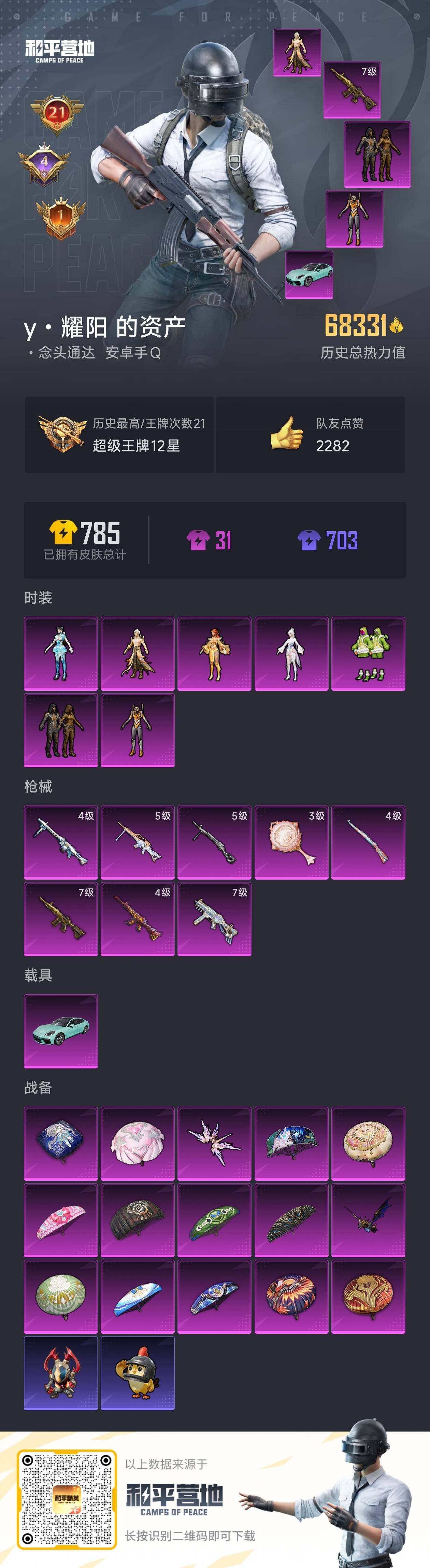 - [14567065]【店主推荐捡漏号!可直接换绑】安卓 手Q-4粉装-3特效枪-2载具-4.9w热力值-7王牌印记-152套装-170枪皮【热门品类】:套装-浪漫天命,套装-深海小丑鱼,角色-军刀雅典娜,套装-潮萌小黄鸭,套装-暗影哥特【粉色载具】:玛莎拉蒂Ghibli(粉),帕加尼imola(光影红)【粉色套装】:角色-洛天依,粉装-炫光之旅,角色-烟云彩露,角色-星渊【粉色枪皮等级】:Kar98K-巳巳如意(五级),DP-28-豹影疾电(五级),MG-36-沧焰双生(五级)