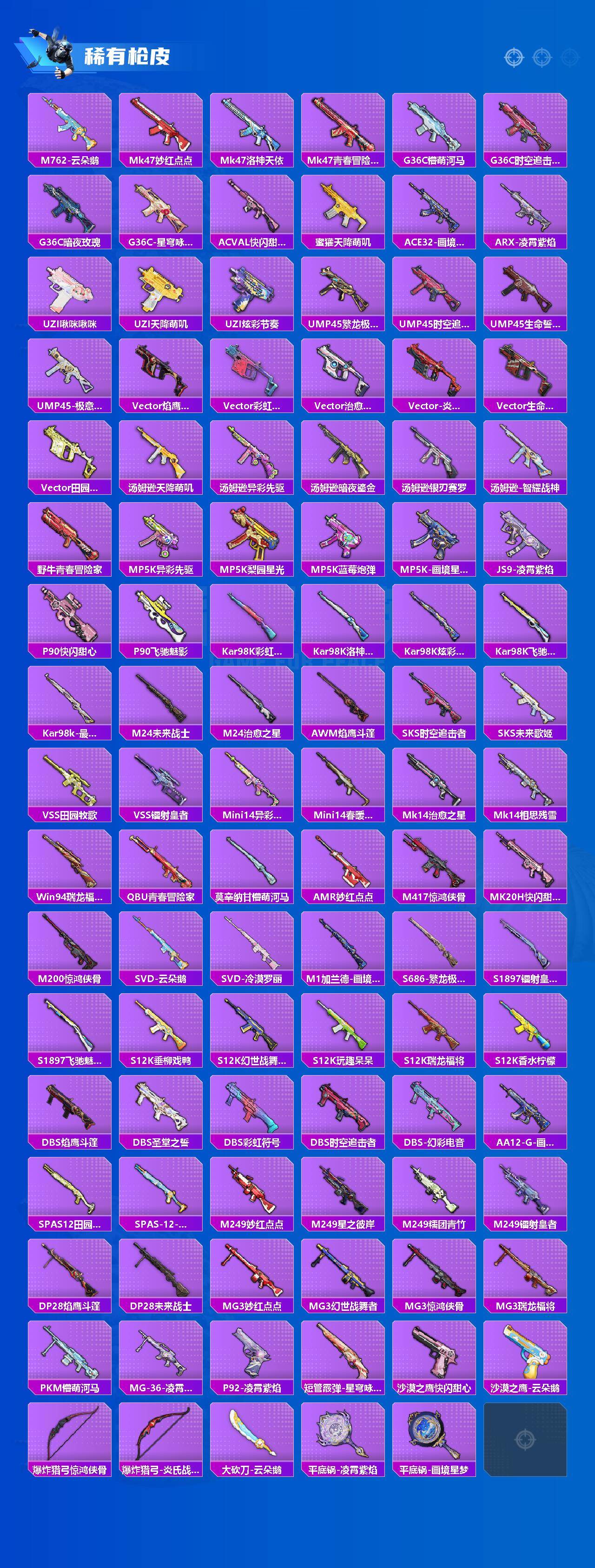 【稀有枪皮】:AKM-夜灯,AKM-彩虹符号,AKM-破晓战魂,AKM-虎虎生威,AKM-霓虹街区,M16A4-幻世战舞者,M16A4-最终圣卫者,SCAR-L-暗夜玫瑰,SCAR-L-红色方程式,M416-红色方程式,GROZA-异彩先驱,GROZA-彩虹符号,GROZA-恐龙拽拽,GROZA-懵萌河马,GROZA-治愈之星,GROZA-田园牧歌,AUG-青春冒险家,QBZ-洛神天依,QBZ-飞驰魅影,M762-天星战神,M762-天降萌叽,M762-牛气冲天,M762-瑞龙福将,M762-镭射皇者,M762-云朵鹅,Mk47-妙红点点,Mk47-洛神天依,Mk47-青春冒险家,G36C-懵萌河马,G36C-时空追击者,G36C-暗夜玫瑰,G36C-星穹咏叹调