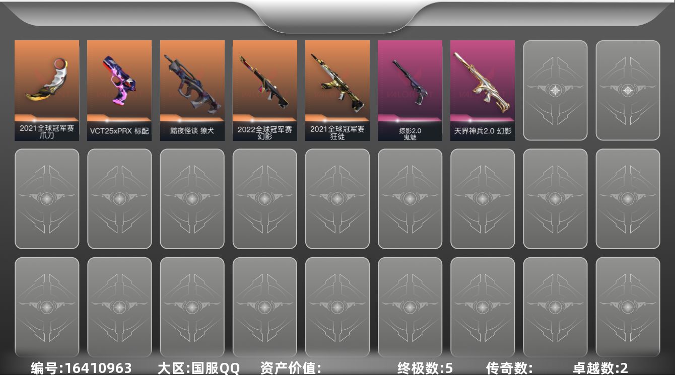 [16410963]【套装】:2021全球冠军赛套装,无畏启程套装 【英雄】:幻棱,炼狱,维斯,暮蝶,钛狐,壹决,铁臂,捷风,雷兹,幽影,不死鸟,贤者,猎枭,蝰蛇,零,芮娜,奇乐,尚勃勒,霓虹,斯凯,夜露,星礈,K/O,海神,盖可,黑梦,钢锁 【近战武器】:近战武器-2021全球冠军赛 爪刀 【狂徒】:狂徒-2021全球冠军赛 【幻影】:幻影-2022全球冠军赛,幻影-天界神兵//2.0,幻影-无畏契约GO!第三卷 【獠犬】:獠犬-黯夜怪谈 【骇灵】:骇灵-无限竞技 【标配】:标配-超能冲撞 【VCT手枪】:标配-VCT25 x PRX 【鬼魅】:鬼魅-掠影//2.0 【卡面】:《双城之战》拥抱 卡面,精灵大战 卡面,欢迎来到底城 卡面,南瓜盛典 卡面,修车达人 卡面,正义的化身 卡面,时间到 卡面,最高舞台 卡面,声感陷阱设计图 卡面,梦幻奶茶 卡面,源能反应 卡面,零点嗅探设计图 卡面,沙雕爆能器 卡面,无畏契约GO!第一卷:芮娜 卡面,清除名单 卡面,无畏契约GO!第一卷:零 卡面,龍记 卡面,暗枪 卡面,无畏契约GO!第一卷:贤者 卡面,"Luie" 卡面,铁臂设计图 卡面,代号红色 卡面,冰淇淋店 卡面,新兵报到 卡面,友军火力 卡面,V契约 卡面,无畏契约 卡面 【喷漆】:嗨宝南瓜灯 喷漆,嘭! 喷漆,都算到了 喷漆,控场勿近 喷漆,熊抱 喷漆,超级粉丝 喷漆,捷风差距 喷漆,拼一枪 喷漆,我的刀呢? 喷漆,UWU 喷漆,新潮流 喷漆,双击点赞 喷漆,醒狮贺春 喷漆,蕊形灯 喷漆,胜利属于无畏契约 喷漆,GLHF 喷漆,无畏契约 喷漆 【挂饰】:伞绳 挂饰,《双城之战》小蛋糕 挂饰,第九季//第三幕 纪念币 挂饰,熔岩灯 挂饰,第九季//第二幕 纪念币 挂饰,袖珍捷风 挂饰,第九季//第一幕 纪念币 挂饰,荧光棒 挂饰,第八季//第三幕 纪念币 挂饰,传世莲华 挂饰,第八季//第二幕 纪念币 挂饰 ,好运福爪 挂饰,第八季//第一幕 纪念币 挂饰,第七季:青铜 挂饰,第七季//第三幕 纪念币 挂饰,第七季//第二幕 纪念币 挂饰,无畏契约 纪念币 挂饰