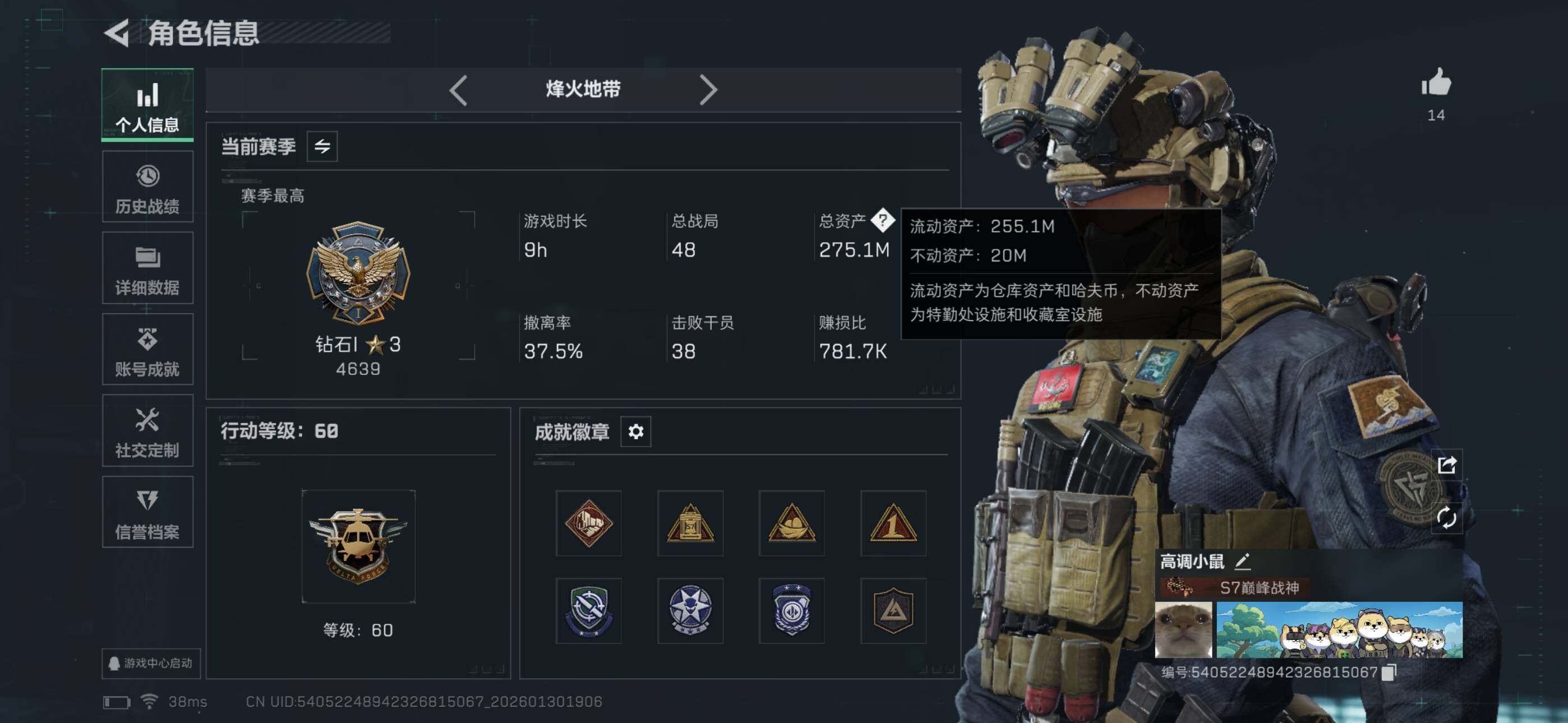 275m总资产-190725k哈伏币-60烽火等级-钻石-23战场等级-列兵