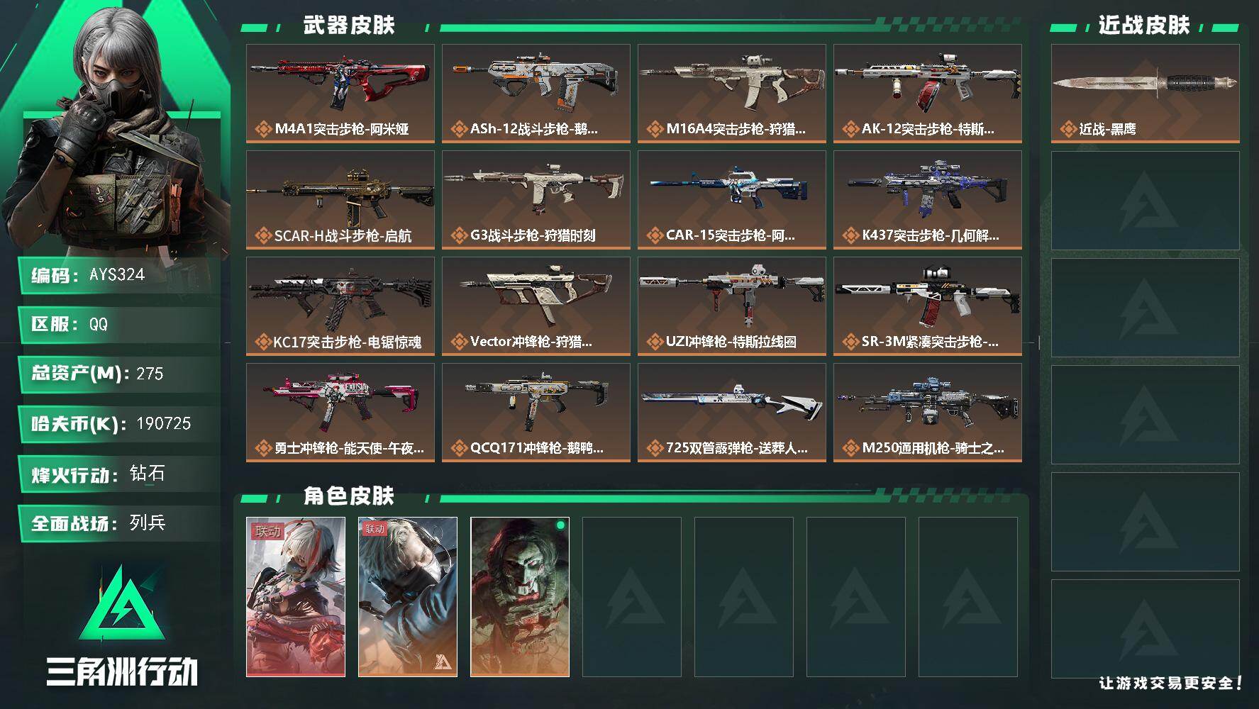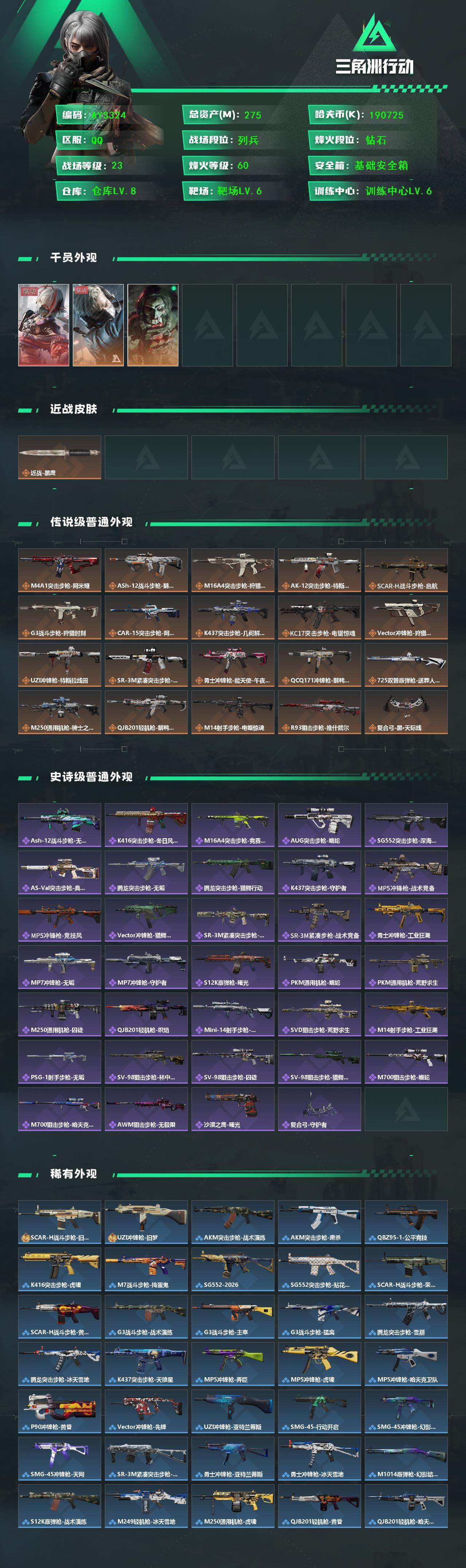 [16411322]【特价出售/店主推荐】 275m总资产-190725k哈伏币-60烽火等级-钻石-23战场等级-列兵 【干员外观】:骇爪-维什戴尔,蜂医-送葬人·无题密令,红狼-电锯惊魂 【近战皮肤】:近战-黑鹰 【传说外观】:M4A1突击步枪-阿米娅,ASh-12战斗步枪-鹅鸭杀,M16A4突击步枪-狩猎时刻,AK-12突击步枪-特斯拉线圈,SCAR-H战斗步枪-启航,G3战斗步枪-狩猎时刻,CAR-15突击步枪-阿米娅,K437突击步枪-几何解构,KC17突击步枪-电锯惊魂,Vector冲锋枪-狩猎时刻,UZI冲锋枪-特斯拉线圈,SR-3M紧凑突击步枪-特斯拉线圈,勇士冲锋枪-能天使-午夜邮差,QCQ171冲锋枪-鹅鸭杀,725双管霰弹枪-送葬人-无题密令,M250通用机枪-骑士之心,QJB201轻机枪-鹅鸭杀,M14射手步枪-电锯惊魂,R93狙击步枪-维什戴尔,复合弓-黑·天际线 【史诗外观】:ASh-12战斗步枪-无极限,K416突击步枪-冬日风情,M16A4突击步枪-竞赛选手,AUG突击步枪-蝮蛇,SG552突击步枪-深海恐惧,AS Val突击步枪-典狱官,腾龙突击步枪-无垢,腾龙突击步枪-猎鳄行动,K437突击步枪-守护者,MP5冲锋枪-战术竞备,MP5冲锋枪-竞技风,Vector冲锋枪-猎鳄行动,SR-3M紧凑突击步枪-荒野求生,SR-3M紧凑突击步枪-战术竞备,勇士冲锋枪-工业狂潮,MP7冲锋枪-无垢,MP7冲锋枪-守护者,S12K霰弹枪-曙光,PKM通用机枪-蝮蛇,PKM通用机枪-荒野求生,M250通用机枪-囚徒,QJB201轻机枪-炽焰,Mini-14射手步枪-守护者,SVD狙击步枪-荒野求生,M14射手步枪-工业狂潮,PSG-1射手步枪-无垢,SV-98狙击步枪-林中猎手,SV-98狙击步枪-囚徒,SV-98狙击步枪-猎鳄行动,M700狙击步枪-蝮蛇,M700狙击步枪-哈夫克警备,AWM狙击步枪-无极限,沙漠之鹰-曙光,复合弓-守护者 【稀有外观】:SCAR-H战斗步枪-旧梦,UZI冲锋枪-旧梦,AKM突击步枪-战术演练,AKM突击步枪-肃杀,QBZ95-1突击步枪-公平竞技,K416突击步枪-虎啸,M7战斗步枪-捣蛋鬼,SG552突击步枪-2026,SG552突击步枪-贴花艺术,SCAR-H战斗步枪-荣耀列队,SCAR-H战斗步枪-黄昏,G3战斗步枪-战术
