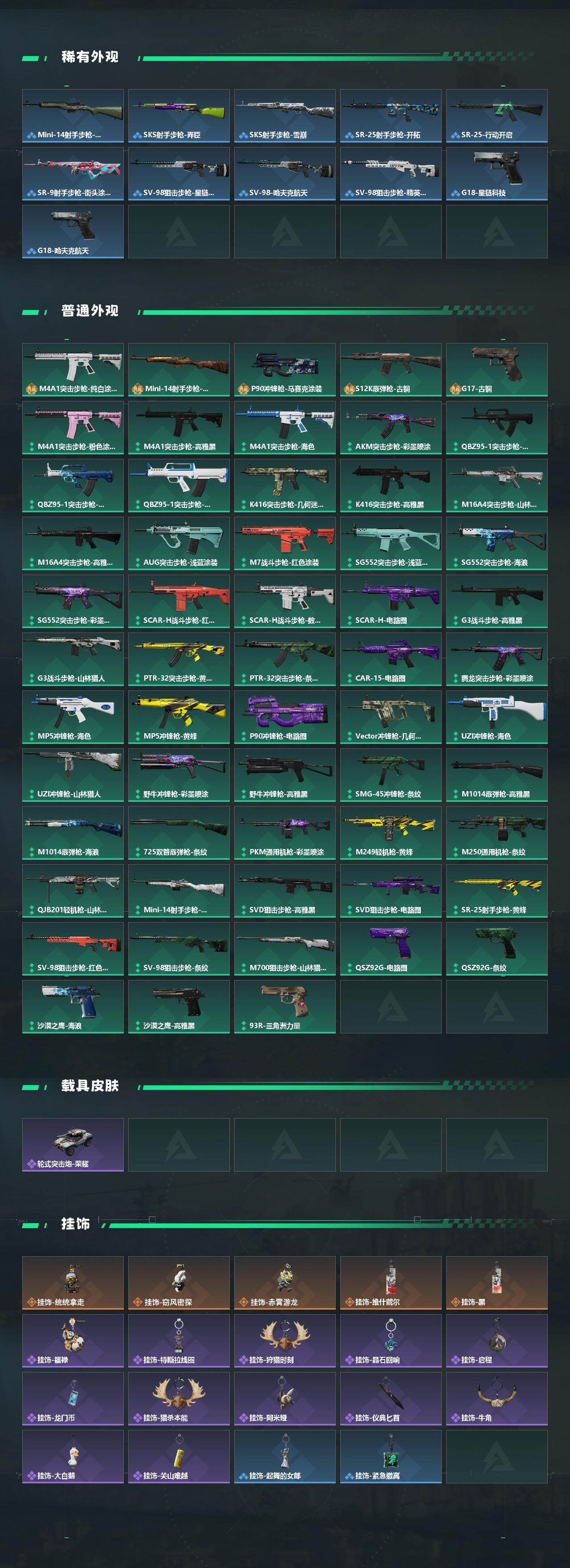 【稀有外观】:SCAR-H战斗步枪-旧梦,UZI冲锋枪-旧梦,AKM突击步枪-战术演练,AKM突击步枪-肃杀,QBZ95-1突击步枪-公平竞技,K416突击步枪-虎啸,M7战斗步枪-捣蛋鬼,SG552突击步枪-2026,SG552突击步枪-贴花艺术,SCAR-H战斗步枪-荣耀列队,SCAR-H战斗步枪-黄昏,G3战斗步枪-战术