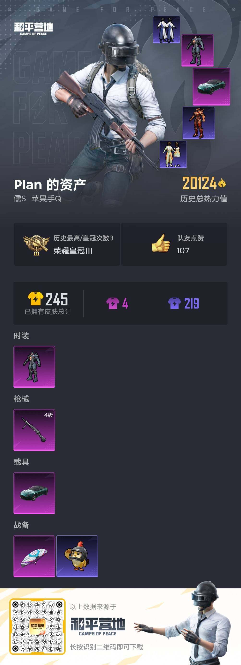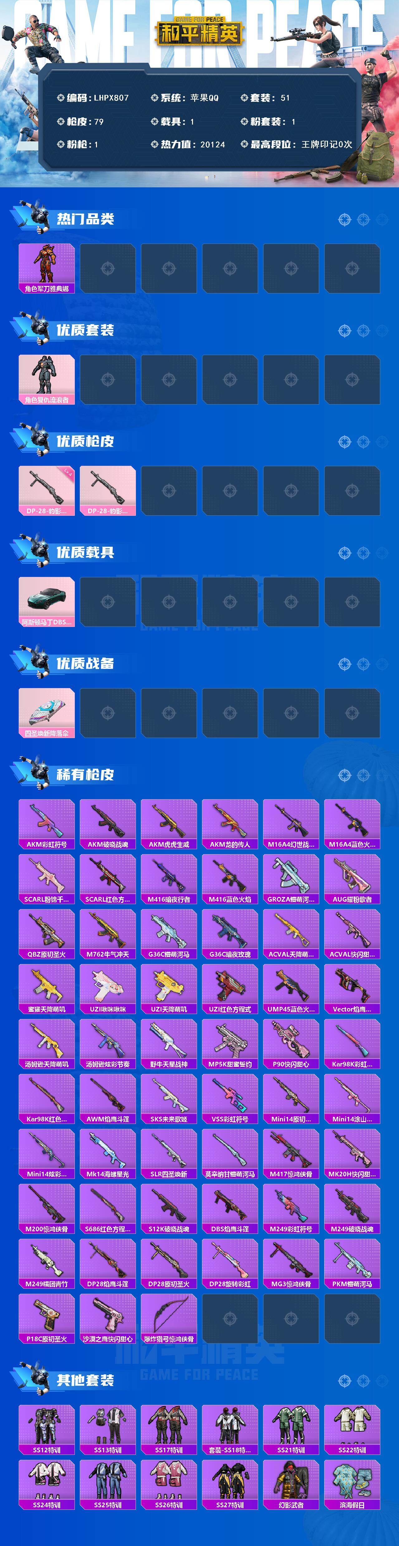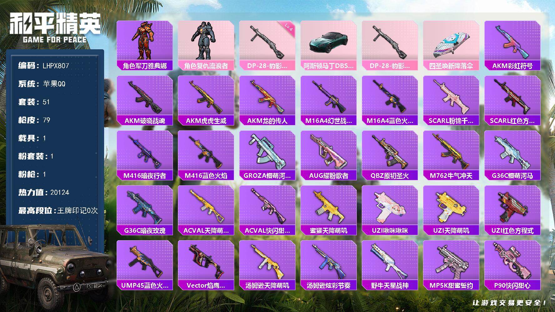 [16379595]【店主推荐捡漏号!可直接换绑】苹果 手Q-1粉装-1特效枪-1载具-0粉色飞行器-20124热力值-1王牌印记-51套装-79枪皮【热门品类】:角色-军刀雅典娜【粉色套装】:角色-复仇流浪者【粉色枪皮等级】:DP-28-豹影疾电(四级)【粉色载具】:阿斯顿马丁DBS(绿)【粉色枪皮】:DP-28-豹影疾电