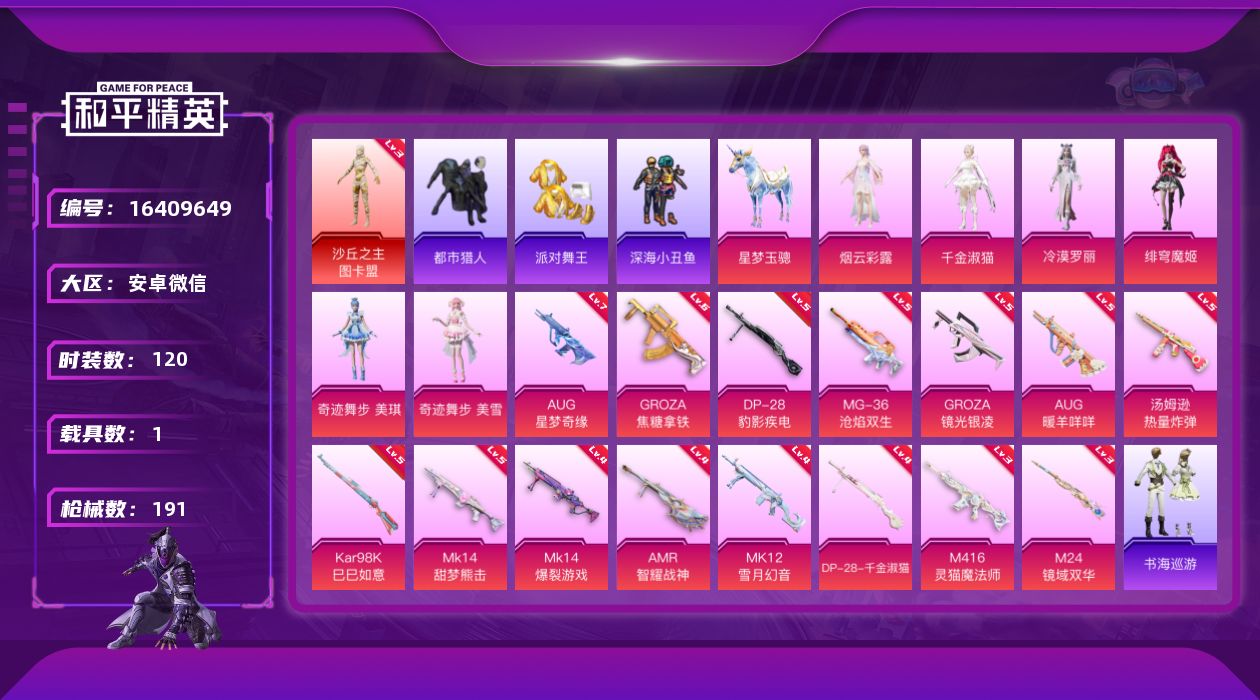 [16409649]【特价出售/店主推荐】安卓 微信-1神装-6粉装-16特效枪-1载具-8粉色飞行器-6.7w热力值-6王牌印记-120套装-191枪皮