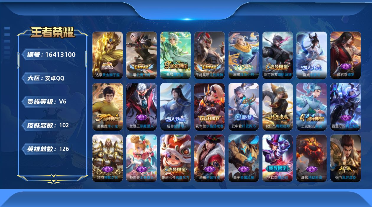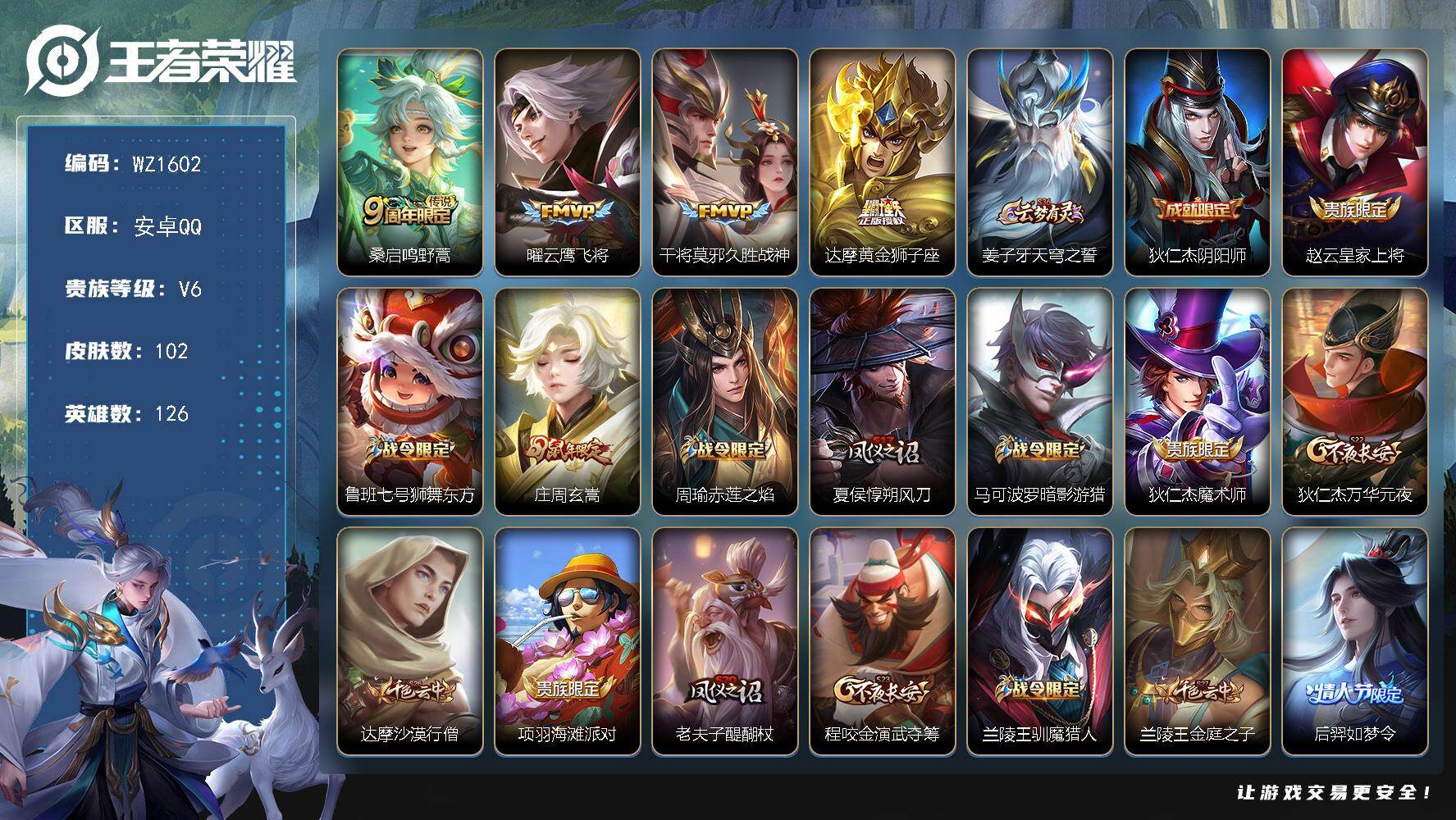 - [15156135]【店主推荐捡漏号!可直接换绑】 安卓Q-V1-最强王者段位-125英雄-171皮肤-6传说-1星传说-32史诗 【传说皮肤】:后羿神树通天,公孙离云诺千山,澜愿照九州拓,桑启鸣野蒿,西施游龙清影,孙尚香末日机甲 【限定皮肤】:姜子牙天穹之誓,狄仁杰阴阳师,赵云皇家上将,高渐离玩趣恶龙,白起夜都怪侠,夏侯惇朔风刀,曹操烛龙,狄仁杰魔术师,狄仁杰万华元夜,达摩沙漠行僧,项羽海滩派对,老夫子醍醐杖,程咬金演武夺筹,露娜一生所爱,兰陵王金庭之子,李元芳云中旅人,钟馗驱傩正仪,干将莫邪胡桃夹子,蔡文姬繁星吟游,鬼谷子原初探秘者,鬼谷子五谷丰年,苏烈千军破阵,弈星混沌棋,梦奇顽趣,沈梦溪大漠名商,明世隐疑决卦,明世隐吟游魔法,裴擒虎擒涛扼浪,盾山御銮,上官婉儿梁祝,嫦娥暖冬兔眠,鲁班大师探海日志,桑启海盐诗旅,暃星界游侠,沈梦溪龙舞盛年,刘邦剑破天穹,周瑜熔金海岸 【赛季限定】:夏侯惇朔风刀,曹操烛龙,狄仁杰万华元夜,达摩沙漠行僧,老夫子醍醐杖,程咬金演武夺筹,兰陵王金庭之子,李元芳云中旅人,钟馗驱傩正仪,鬼谷子原初探秘者,苏烈千军破阵,弈星混沌棋,梦奇顽趣,沈梦溪大漠名商,明世隐疑决卦,裴擒虎擒涛扼浪,盾山御銮,鲁班大师探海日志,桑启海盐诗旅,刘邦剑破天穹,姜子牙天穹之誓 【战令限定】:白起夜都怪侠,明世隐吟游魔法,嫦娥暖冬兔眠,暃星界游侠 【史诗皮肤】:露娜紫霞仙子,赵云皇家上将,狄仁杰魔术师,廉颇地狱岩魂,宫本武藏鬼剑武藏,孙尚香水果甜心,嬴政暗夜贵公子,妲己魅力维加斯,墨子金属风暴,吕布圣诞狂欢,曹操幽灵船长,吕布末日机甲,花木兰水晶猎龙者,百里守约特工魅影,李元芳逐浪之夏,孙策猫狗日记,露娜一生所爱,狄仁杰鹰眼统帅,上官婉儿梁祝,蔡文姬繁星吟游,娜可露露晚萤,澜赏金猎手,明世隐吟游魔法,鬼谷子五谷丰年,梦奇顽趣,暃星界游侠,孙膑茶境仙,阿轲化蝶舞,狂铁龙之律动,百里守约雪豹霜爪,公孙离涂山容容,女娲万灵启世 【其他皮肤】:项羽海滩派对,韩信教廷特使,韩信街头霸王,达摩大发明家,赵云忍炎影,芈月红桃皇后,程咬金星际陆战队,白起白色死神,扁鹊化身博士,扁鹊救世之瞳,宫本武藏未来纪元,孙膑天使之翼,妲己少女阿狸,典韦黄金武士,亚瑟死亡骑士,达摩拳王,花木兰兔女郎,刘备万事如意,宫本武藏万象初新,狄仁杰阴阳师,刘备纽约教父,关羽龙腾万里,墨子进击墨子号,钟无艳海滩丽影,