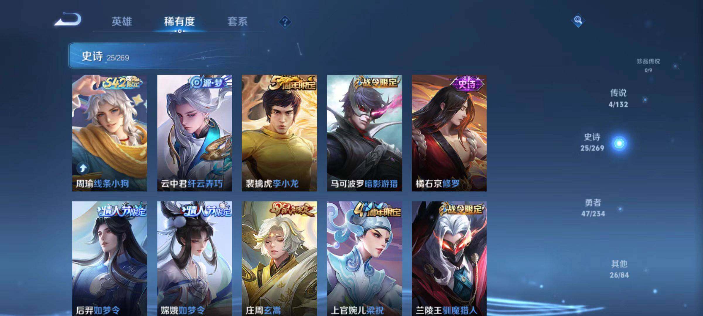 【史诗皮肤】:项羽苍穹之光,赵云皇家上将,王昭君偶像歌手,狄仁杰魔术师,廉颇地狱岩魂,孙尚香水果甜心,妲己魅力维加斯,墨子金属风暴,吕布圣诞狂欢,张飞乱世虎臣,花木兰水晶猎龙者,百里守约特工魅影,程咬金功夫厨神,鲁班七号狮舞东方,狄仁杰鹰眼统帅,兰陵王驯魔猎人,上官婉儿梁祝,庄周玄嵩,嫦娥如梦令,后羿如梦令,橘右京修罗,马可波罗暗影游猎,裴擒虎李小龙,云中君纤云弄巧,周瑜线条小狗