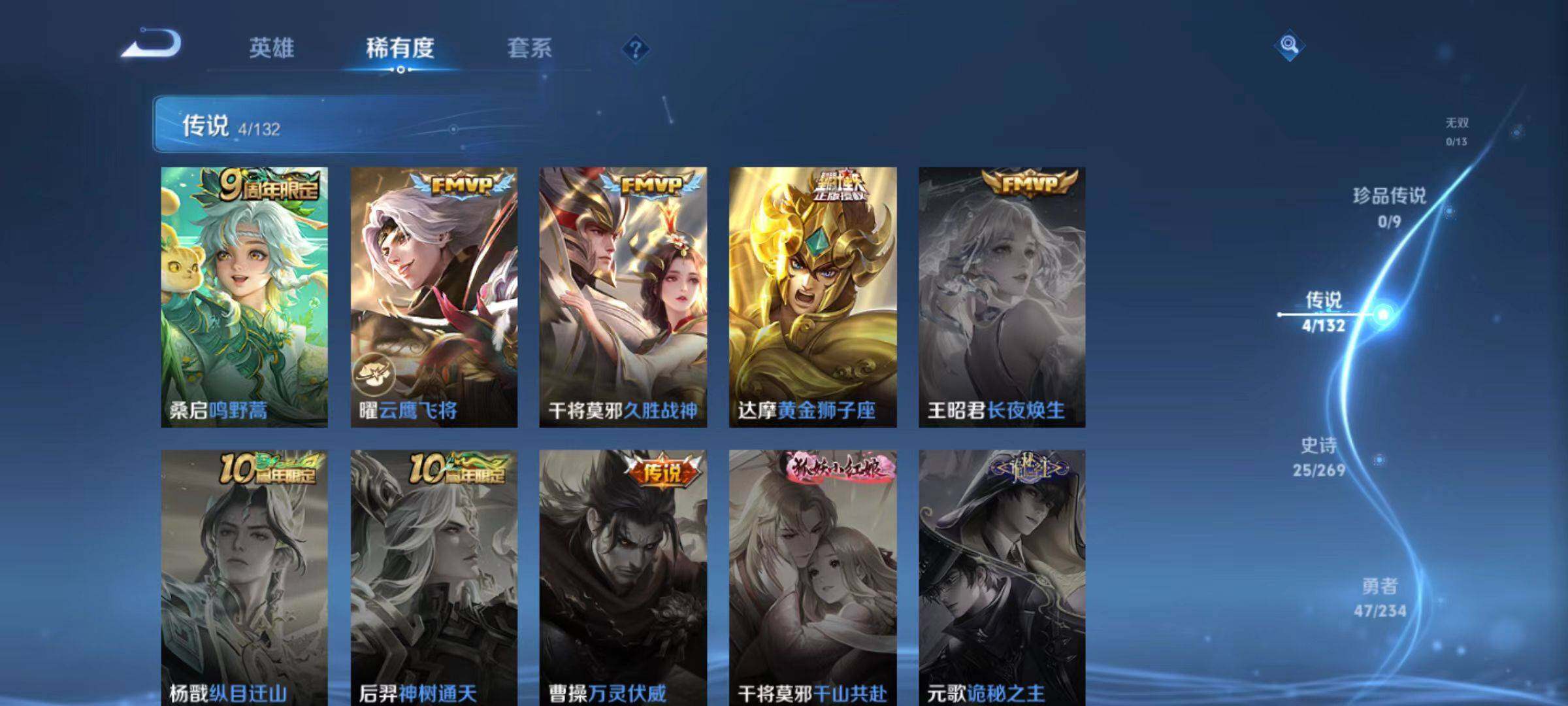 【传说皮肤】:桑启鸣野蒿,曜云鹰飞将,干将莫邪久胜战神,达摩黄金狮子座