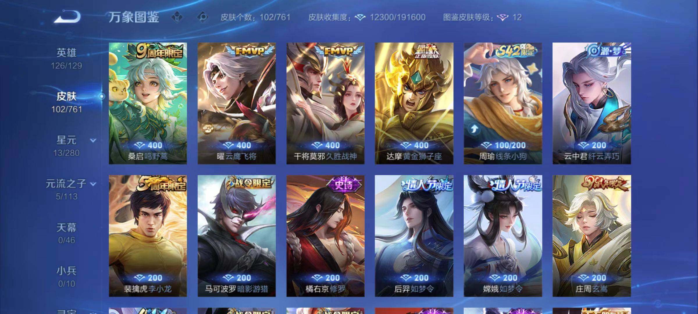 - PX_2093808-贵族8/皮肤293/典藏3/传说9/史诗75/英雄125/鸣剑曳影/星域神启/银白咏叹调/安琪拉酷洛米之心/女武神/玩趣恶龙/特工战影/黄金白羊座/一念神魔/启明星使/寅虎赤拳/无限倾心男/惊梅引/影龙天霄/桑启鸣野蒿/虞姬愿照岁时盈/大乔绒语心约/姜子牙天穹之誓/杨戬破阵退雄兵/狄仁杰阴阳师/赵云皇家上将/墨子神迹守卫/乒乒小将/玩趣恶龙/钟无艳超时空战士/扁鹊奇幻香踪/芈