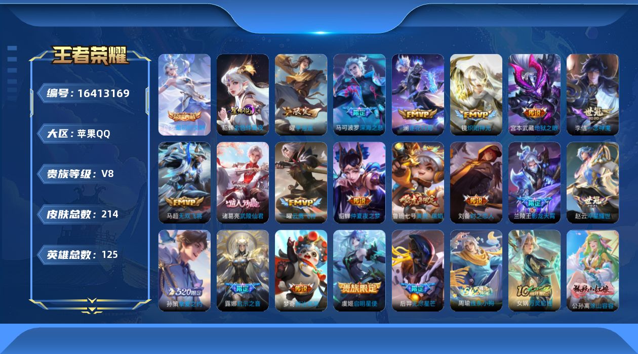 [16413169]苹果Q-214皮肤-1典藏皮肤-20传说-61史诗 【荣耀典藏】:伽罗最初的交响 【传说皮肤】:干将莫邪千山共赴,澜逐花归海,兰陵王影龙天霄,马可波罗深海之息,后羿无尽星芒,马超无双飞将,孙策挚爱之约,露娜启示之音,鲁班七号寅虎瑞焰,赵云淬星耀世,曜李逍遥 ,镜炽阳神光,虞姬启明星使,曜云鹰飞将,李信一念神魔,刘备时之恋人,梦奇胖达荣荣,诸葛亮武陵仙君,貂蝉仲夏夜之梦,宫本武藏地狱之眼 【限定皮肤】:姜子牙天穹之誓,狄仁杰阴阳师,赵云皇家上将,赵云百木心枪,鲁班七号寅虎瑞焰,庄周高山流水,高渐离玩趣恶龙,白起夜都怪侠,芈月幻夜卜梦,元歌无心,夏侯惇匿光决锋者,马可波罗深海之息,马可波罗山海玄木吟,狄仁杰魔术师,狄仁杰万华元夜,达摩沙漠行僧,项羽海滩派对,程咬金演武夺筹,露娜启示之音,韩信傲雪梅枪,王昭君午后时光,兰陵王影龙天霄,兰陵王金庭之子,孙悟空至尊宝,孙悟空孙行者,后羿无尽星芒,李元芳云中旅人,虞姬启明星使,钟馗驱傩正仪,干将莫邪胡桃夹子,鬼谷子五谷丰年,诸葛亮武陵仙君,黄忠火炮绅士,铠青龙志,苏烈千军破阵,沈梦溪大漠名商,明世隐吟游魔法,裴擒虎李小龙,裴擒虎擒涛扼浪,狂铁电玩高手,云中君时之祈愿,孙策挚爱之约,上官婉儿天狼绘梦者,嫦娥拒霜思,曜李逍遥 ,鲁班大师探海日志,桑启海盐诗旅,阿古朵江河有灵,张良古海寻踪,鬼谷子天穹祈灯,刘邦剑破天穹,周瑜熔金海岸 【年限皮肤】:铠青龙志,鲁班七号寅虎瑞焰,马可波罗山海玄木吟 【赛季限定】:狄仁杰万华元夜,程咬金演武夺筹,钟馗驱傩正仪,苏烈千军破阵,达摩沙漠行僧,兰陵王金庭之子,沈梦溪大漠名商,李元芳云中旅人,桑启海盐诗旅,裴擒虎擒涛扼浪,鲁班大师探海日志,张良古海寻踪,鬼谷子天穹祈灯,刘邦剑破天穹,姜子牙天穹之誓,东皇太一噬灭天穹,太乙真人谧流熔炉,钟馗虚灵犬护,亚瑟荣光之誓 【战令限定】:黄忠火炮绅士,芈月幻夜卜梦,明世隐吟游魔法,白起夜都怪侠,狂铁电玩高手,王昭君午后时光,周瑜百相守梦,孙策百相守梦,周瑜线条小狗 【史诗皮肤】:露娜紫霞仙子,赵云皇家上将,貂蝉圣诞恋歌,甄姬冰雪圆舞曲,狄仁杰魔术师,廉颇地狱岩魂,宫本武藏鬼剑武藏,孙尚香水果甜心,妲己魅力维加斯,妲己女仆咖啡,墨子金属风暴,吕布圣诞狂欢,刘禅绅士熊喵,曹操幽灵船长,李白千年之狐,吕布末日机甲,韩信白龙吟,孙悟空至尊宝,花木兰水晶猎龙者,刘邦德古