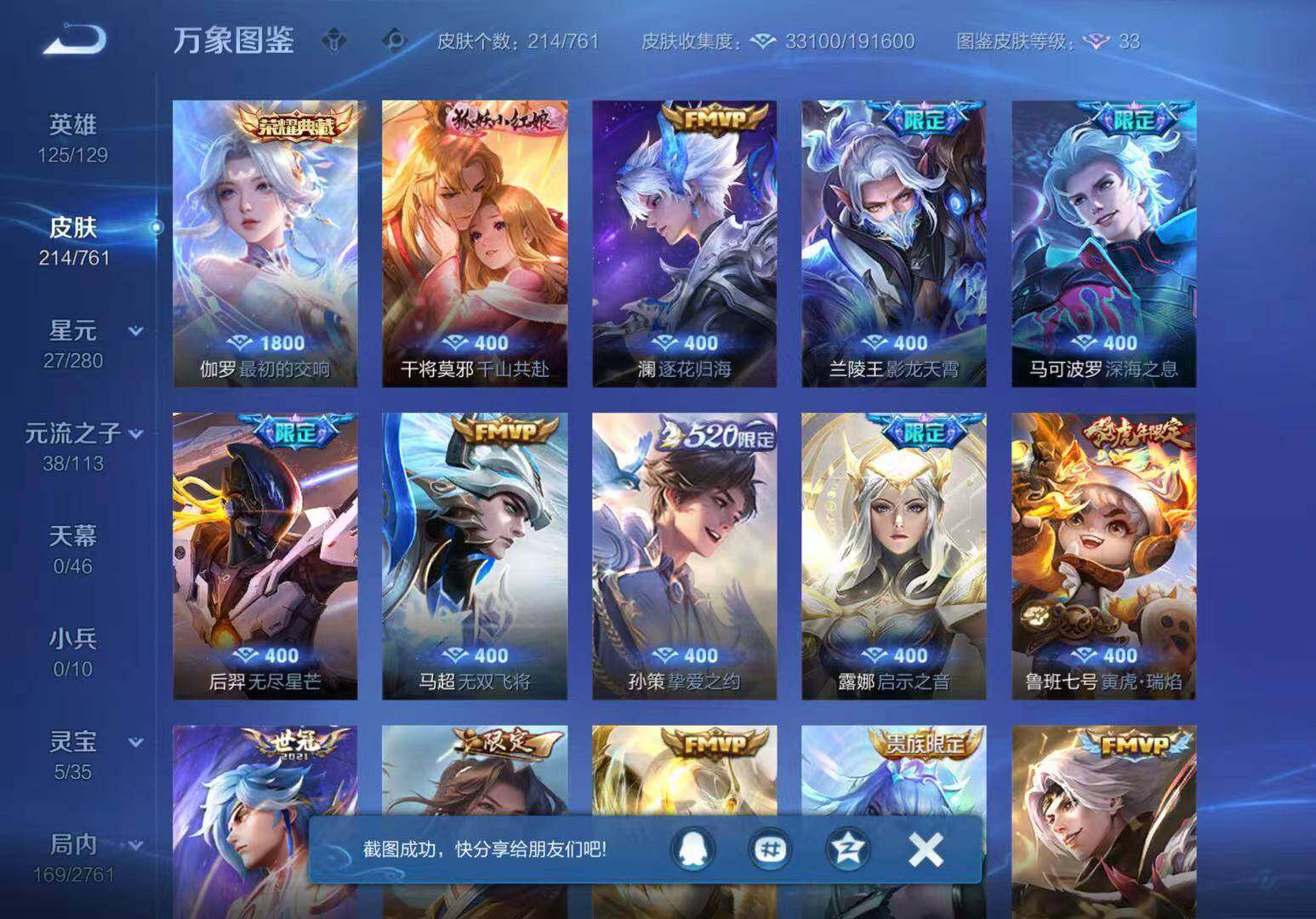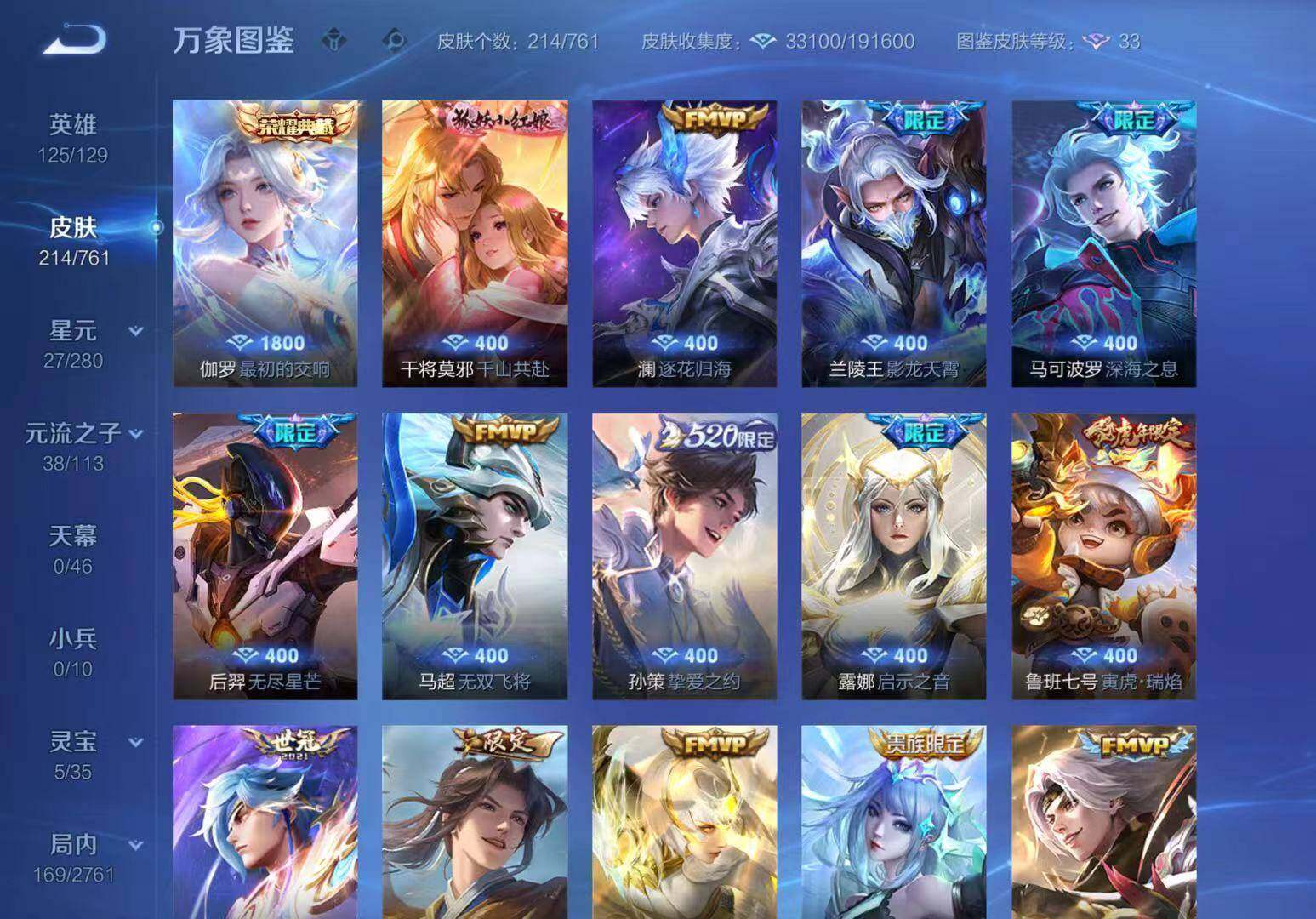 【限定皮肤】:姜子牙天穹之誓,狄仁杰阴阳师,赵云皇家上将,赵云百木心枪,鲁班七号寅虎瑞焰,庄周高山流水,高渐离玩趣恶龙,白起夜都怪侠,芈月幻夜卜梦,元歌无心,夏侯惇匿光决锋者,马可波罗深海之息,马可波罗山海玄木吟,狄仁杰魔术师,狄仁杰万华元夜,达摩沙漠行僧,项羽海滩派对,程咬金演武夺筹,露娜启示之音,韩信傲雪梅枪,王昭君午后时光,兰陵王影龙天霄,兰陵王金庭之子,孙悟空至尊宝,孙悟空孙行者,后羿无尽星芒,李元芳云中旅人,虞姬启明星使,钟馗驱傩正仪,干将莫邪胡桃夹子,鬼谷子五谷丰年,诸葛亮武陵仙君,黄忠火炮绅士,铠青龙志,苏烈千军破阵,沈梦溪大漠名商,明世隐吟游魔法,裴擒虎李小龙,裴擒虎擒涛扼浪,狂铁电玩高手,云中君时之祈愿,孙策挚爱之约,上官婉儿天狼绘梦者,嫦娥拒霜思,曜李逍遥 ,鲁班大师探海日志,桑启海盐诗旅,阿古朵江河有灵,张良古海寻踪,鬼谷子天穹祈灯,刘邦剑破天穹,周瑜熔金海岸