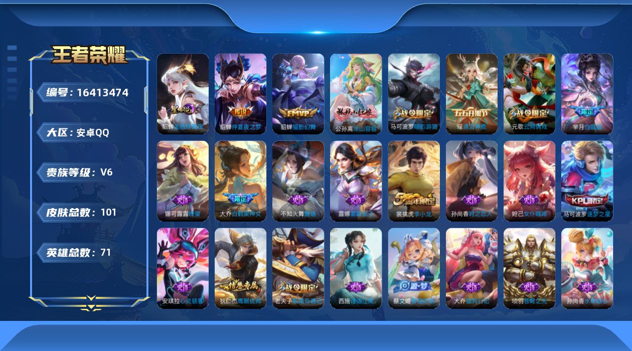 [16413474]安卓Q-101皮肤-2传说-33史诗 【传说皮肤】:貂蝉猫影幻舞,貂蝉仲夏夜之梦 【限定皮肤】:狄仁杰阴阳师,赵云皇家上将,墨子神迹守卫,芈月白晶晶,元歌云间偶戏,马可波罗逐梦之星,马可波罗暗影游猎,狄仁杰魔术师,狄仁杰万华元夜,达摩星际陆战队,项羽海滩派对,老夫子醍醐杖,老夫子航海奇遇记,程咬金演武夺筹,刘邦夺宝奇兵,亚瑟潮玩骑士王,钟馗驱傩正仪,雅典娜单词大作战,蔡文姬繁星吟游,鬼谷子原初探秘者,大乔白鹤梁神女,明世隐疑决卦,裴擒虎李小龙,米莱狄胡桃异想国,伽罗天狼溯光者,猪八戒西部大镖客,蒙犽狂想玩偶喵 【赛季限定】:明世隐疑决卦,老夫子醍醐杖,鬼谷子原初探秘者,狄仁杰万华元夜,程咬金演武夺筹,钟馗驱傩正仪,甄姬逆浪荇歌,亚瑟荣光之誓 【战令限定】:刘邦夺宝奇兵,马可波罗暗影游猎,猪八戒西部大镖客,蒙犽狂想玩偶喵,雅典娜单词大作战,元歌云间偶戏,亚瑟潮玩骑士王,米莱狄胡桃异想国,达摩星际陆战队,老夫子航海奇遇记,墨子神迹守卫 【史诗皮肤】:项羽苍穹之光,露娜紫霞仙子,赵云皇家上将,貂蝉圣诞恋歌,狄仁杰魔术师,宫本武藏鬼剑武藏,孙尚香水果甜心,妲己魅力维加斯,妲己女仆咖啡,小乔缤纷独角兽,马可波罗逐梦之星,雅典娜冰冠公主,安琪拉心灵骇客,大乔猫狗日记,狄仁杰鹰眼统帅,蔡文姬繁星吟游,娜可露露晚萤,大乔白蛇,不知火舞魅语,瑶遇见神鹿,孙尚香时之恋人,马可波罗暗影游猎,蒙犽狂想玩偶喵,裴擒虎李小龙,元歌云间偶戏,芈月白晶晶,米莱狄胡桃异想国,西施诗语江南,百里玄策热力回旋,老夫子航海奇遇记,伽罗天狼溯光者,大乔白鹤梁神女,公孙离涂山容容 【其他皮肤】:项羽海滩派对,韩信教廷特使,露娜哥特玫瑰,扁鹊救世之瞳,安琪拉玩偶对对碰,妲己少女阿狸,亚瑟死亡骑士,花木兰兔女郎,张飞五福同心,甄姬花好人间,狄仁杰阴阳师,大乔守护之力,项羽科学大爆炸,明世隐虹云星官,庄周奇妙博物学,明世隐疑决卦,刘邦夺宝奇兵,老夫子醍醐杖,猪八戒西部大镖客,鬼谷子原初探秘者,雅典娜单词大作战,狄仁杰万华元夜,亚瑟潮玩骑士王,刘禅秘密基地,露娜瓷语鉴心,达摩星际陆战队,程咬金演武夺筹,张良缤纷绘卷,钟馗驱傩正仪,墨子神迹守卫,鲁班大师乓乓大师,姜子牙星梦巡礼,甄姬逆浪荇歌,莱西奥踏浪烽翎,鬼谷子克喵,亚瑟荣光之誓,鲁班七号福禄兄弟,鲁班七号木偶奇遇记,露娜绯红之刃,貂蝉异域舞娘,花木兰剑舞者,王昭