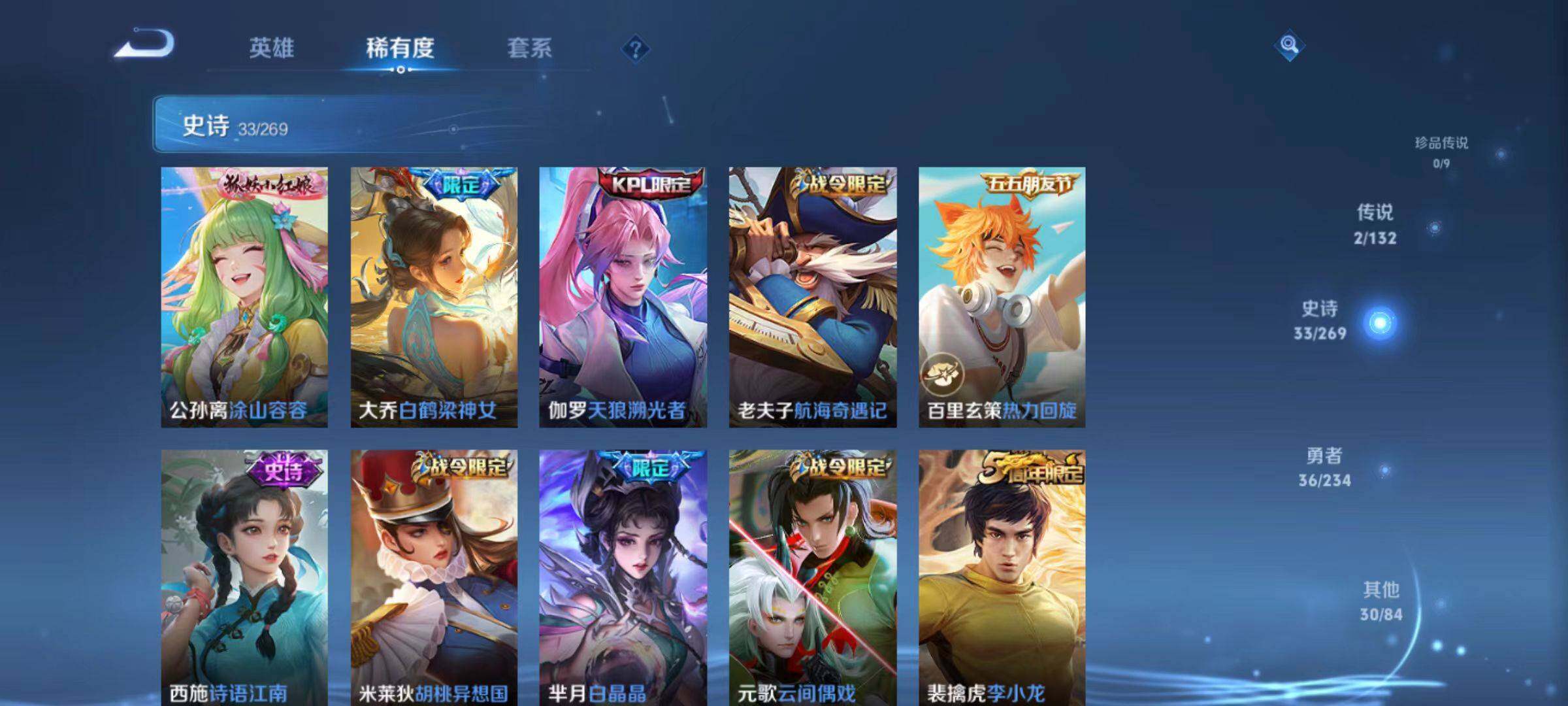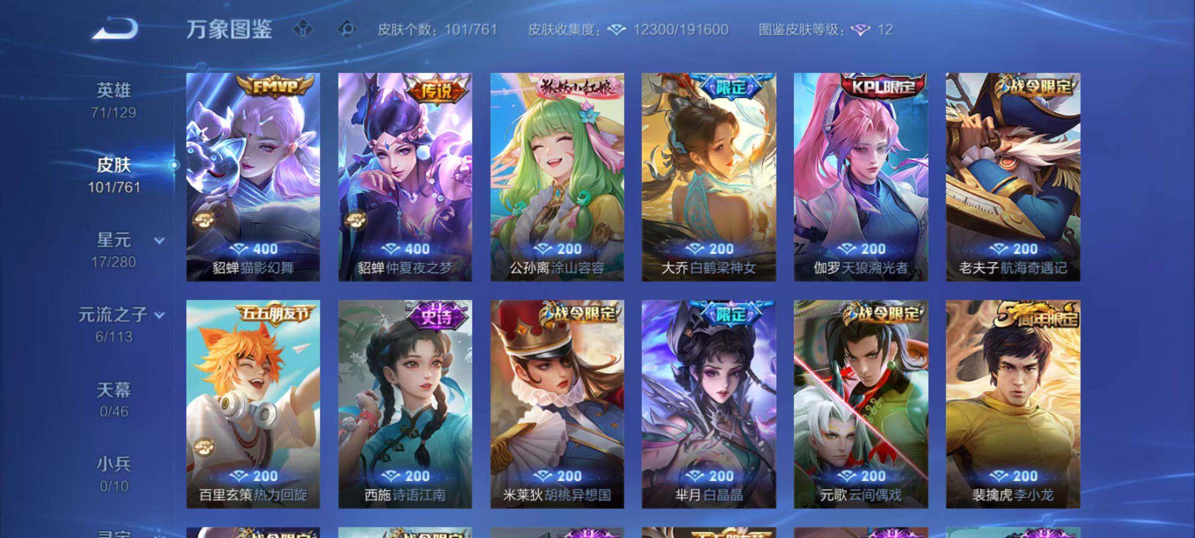 【史诗皮肤】:项羽苍穹之光,露娜紫霞仙子,赵云皇家上将,貂蝉圣诞恋歌,狄仁杰魔术师,宫本武藏鬼剑武藏,孙尚香水果甜心,妲己魅力维加斯,妲己女仆咖啡,小乔缤纷独角兽,马可波罗逐梦之星,雅典娜冰冠公主,安琪拉心灵骇客,大乔猫狗日记,狄仁杰鹰眼统帅,蔡文姬繁星吟游,娜可露露晚萤,大乔白蛇,不知火舞魅语,瑶遇见神鹿,孙尚香时之恋人,马可波罗暗影游猎,蒙犽狂想玩偶喵,裴擒虎李小龙,元歌云间偶戏,芈月白晶晶,米莱狄胡桃异想国,西施诗语江南,百里玄策热力回旋,老夫子航海奇遇记,伽罗天狼溯光者,大乔白鹤梁神女,公孙离涂山容容