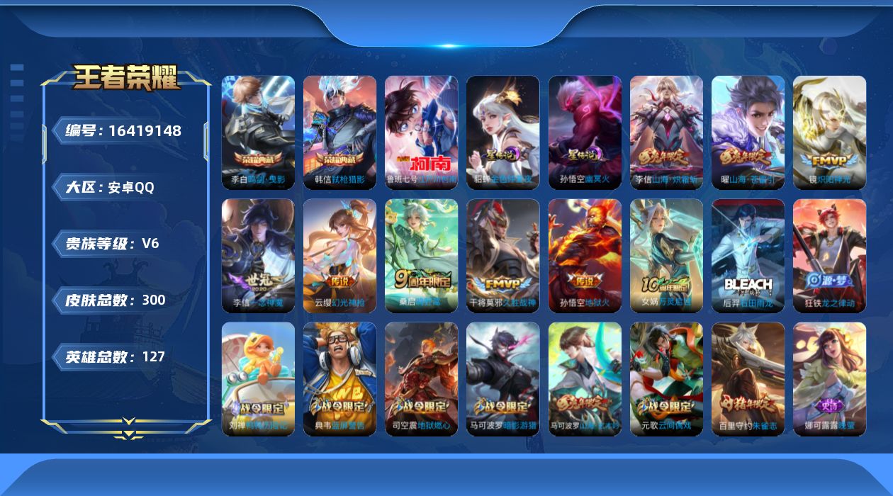 [16419148]【特价急出/详情看图】安卓Q-V6-尊贵铂金I段位-127英雄-300皮肤-2典藏皮肤-1珍品传说-2星元-9传说-83史诗