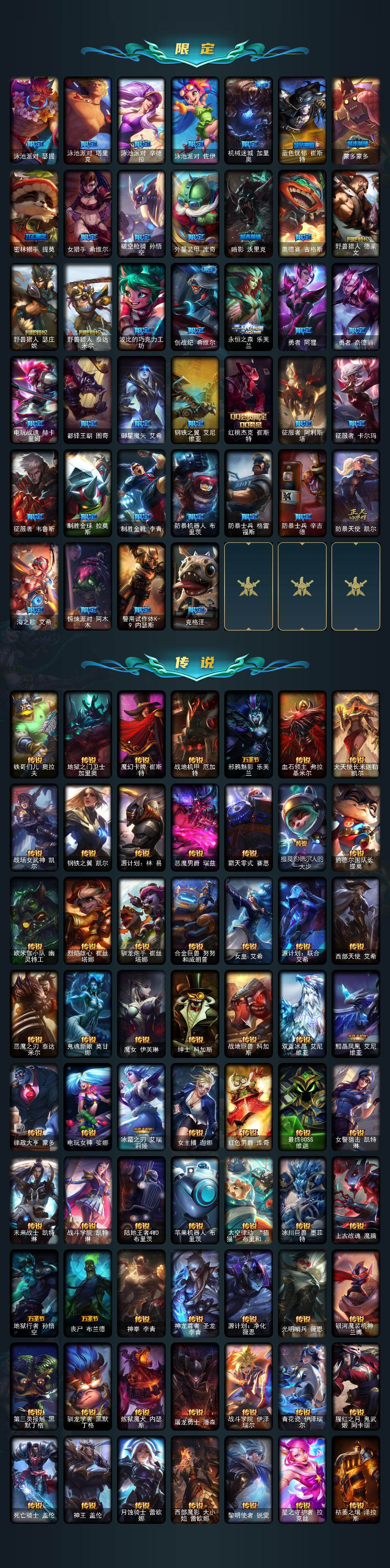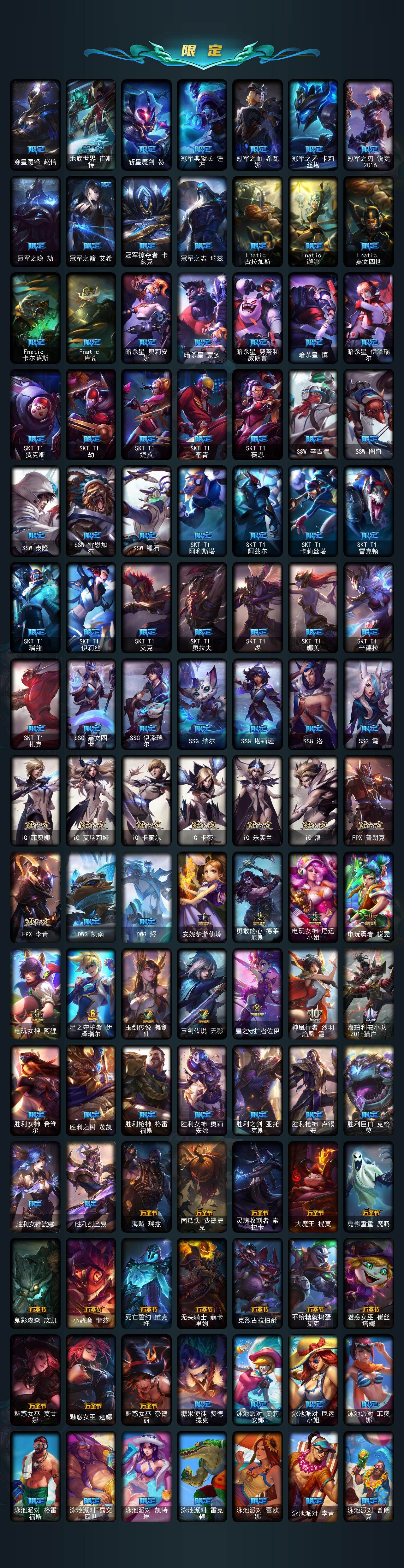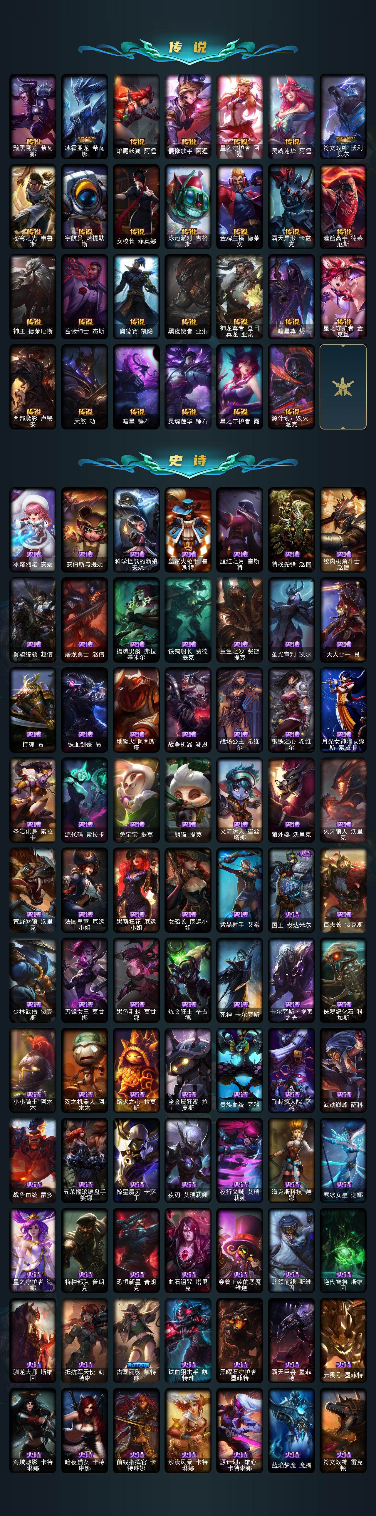 【年限皮肤】:龙的传人李青,银龙裁决泰隆,古琴余韵娑娜,定海神珍孙悟空,醒狮克格莫,你看见过我的熊猫吗安妮,碧玉之牙卡西奥佩娅,神龙之翼库奇,替父从军花木兰,广寒仙子嫦娥,神龙烈焰金克丝,美猴王孙悟空,紫金罗刹莫甘娜,玉净夜叉凯特琳,张辽文远,司马懿仲达,南天之怒沃里克,春晖神女拉克丝,烈焰美人薇恩,纳财大帝塔姆,福牛守护者厄斐琉斯,猛虎下山赵信,剪纸仙灵艾瑞莉娅,天龙之子斯莫德