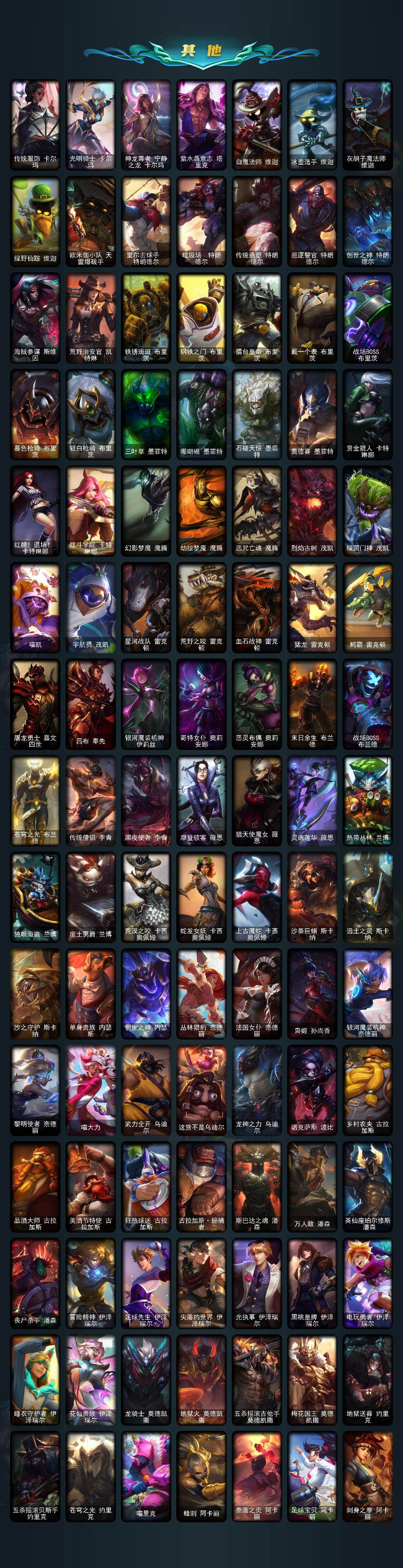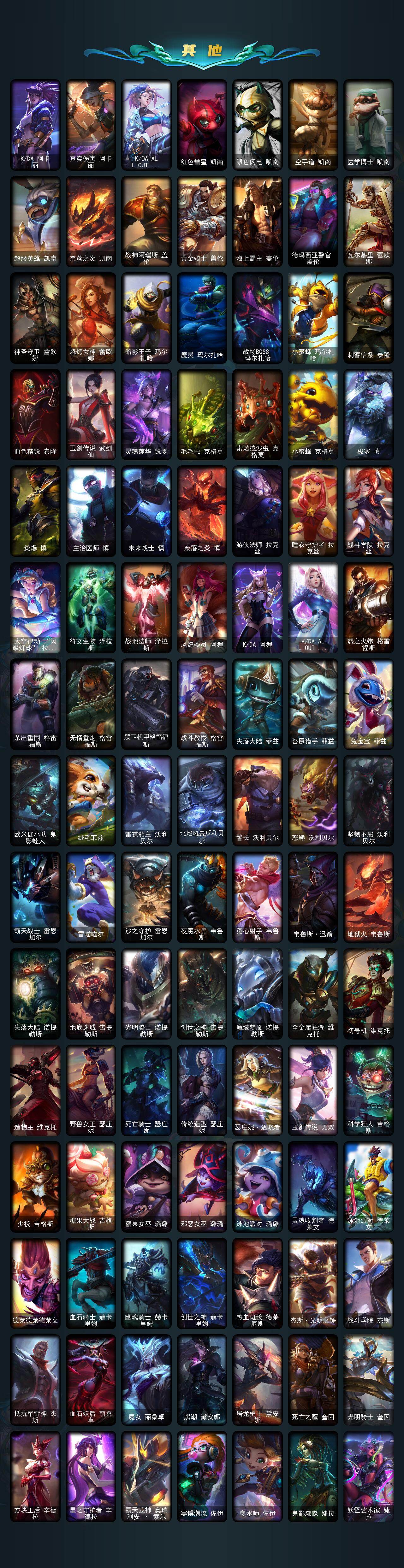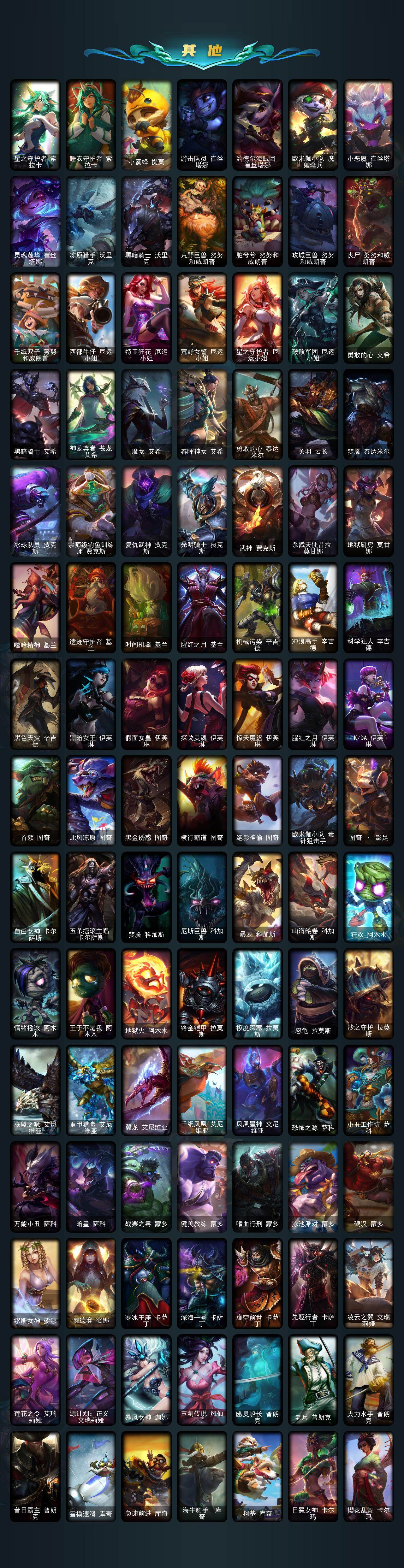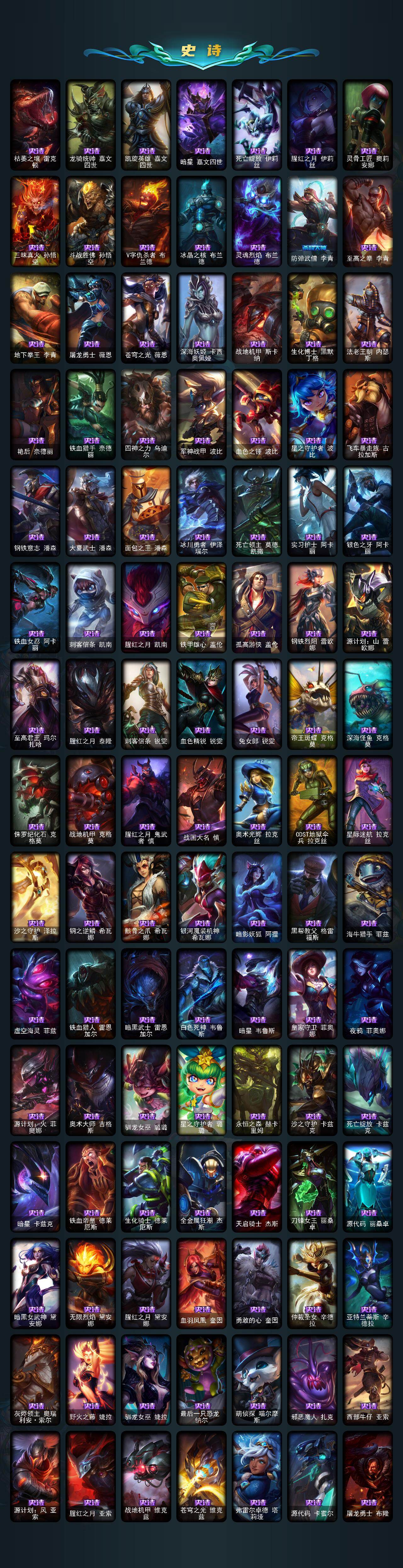 【年限皮肤】:龙的传人李青,银龙裁决泰隆,古琴余韵娑娜,定海神珍孙悟空,醒狮克格莫,你看见过我的熊猫吗安妮,碧玉之牙卡西奥佩娅,神龙之翼库奇,替父从军花木兰,广寒仙子嫦娥,神龙烈焰金克丝,美猴王孙悟空,紫金罗刹莫甘娜,玉净夜叉凯特琳,张辽文远,司马懿仲达,南天之怒沃里克,春晖神女拉克丝,烈焰美人薇恩,纳财大帝塔姆,福牛守护者厄斐琉斯,猛虎下山赵信,剪纸仙灵艾瑞莉娅,天龙之子斯莫德