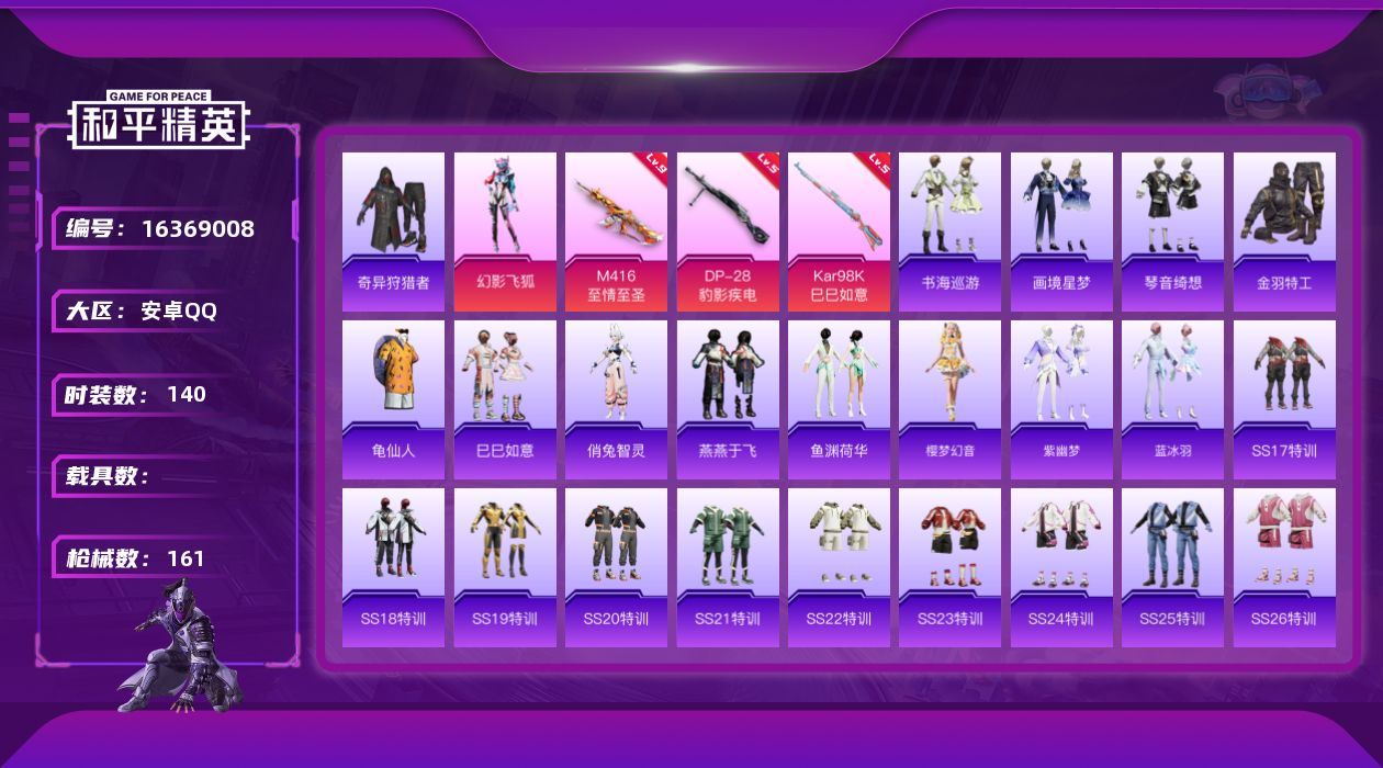 [16369008]安卓 手Q-1粉装-4特效枪-0载具-1粉色飞行器-45632热力值-4王牌印记-140套装-161枪皮