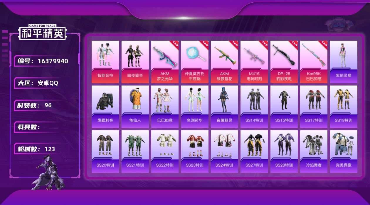 [16379940]安卓 手Q-2粉装-6特效枪-0载具-2粉色飞行器-36415热力值-6王牌印记-96套装-123枪皮