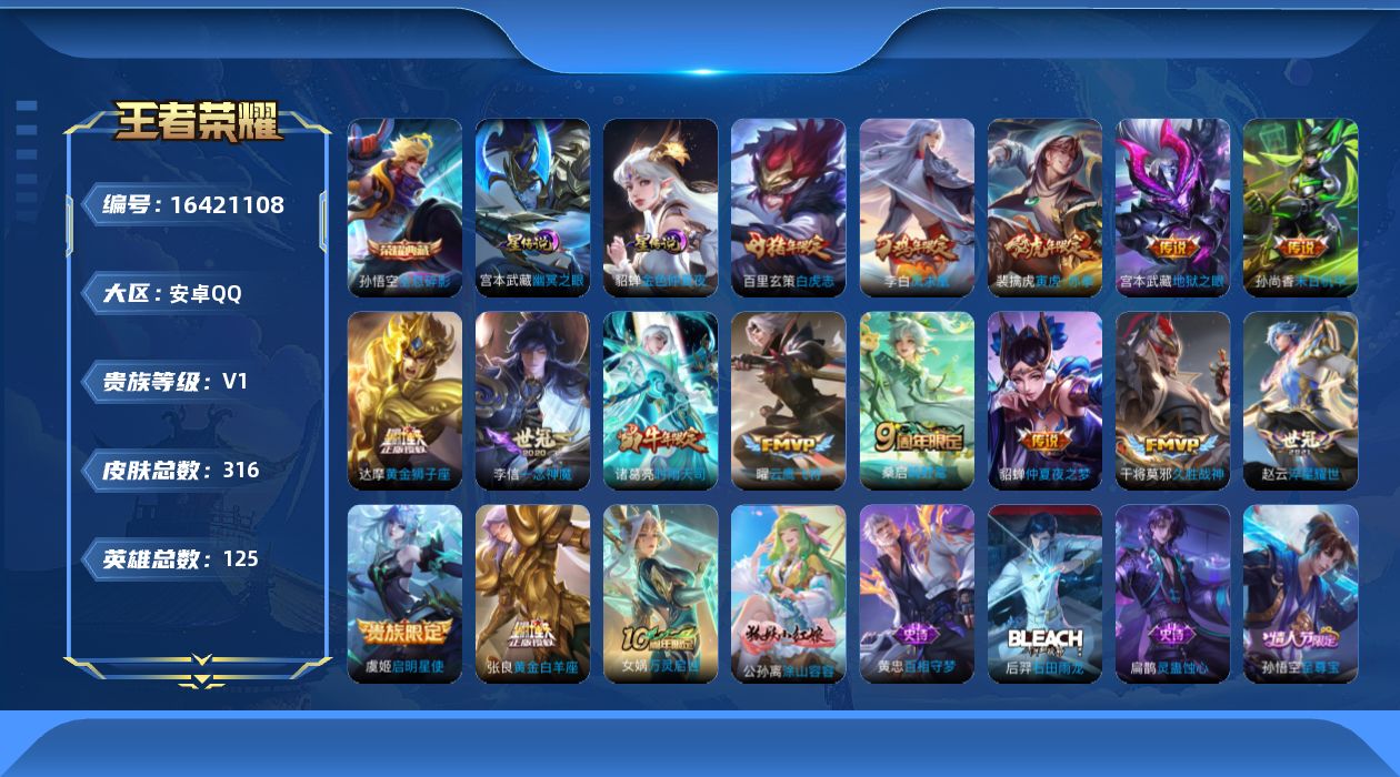 [16421108]【特价急出/详情看图】安卓Q-V0-最强王者段位-125英雄-316皮肤-1典藏皮肤-2星元-16传说-86史诗