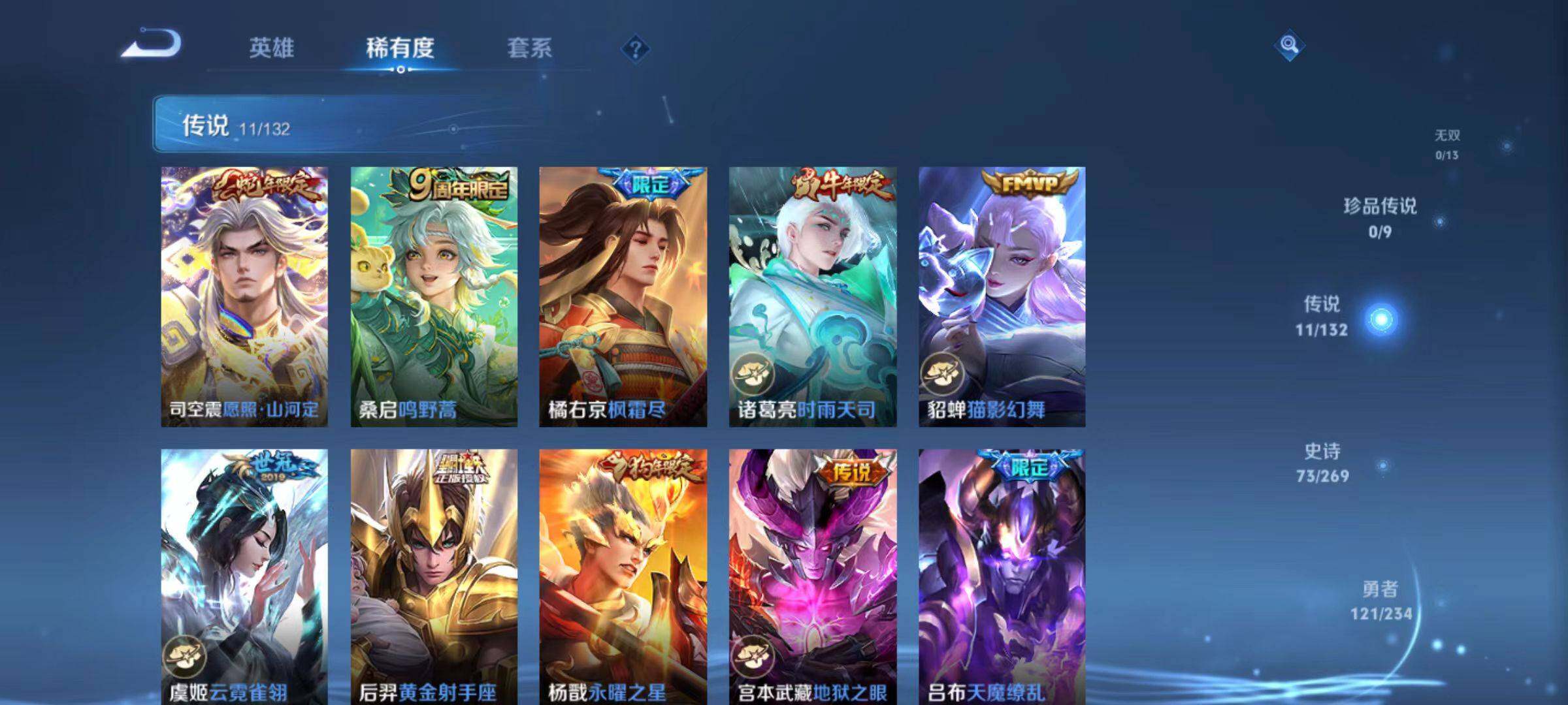 【传说皮肤】:司空震愿照山河定,桑启鸣野蒿,橘右京枫霜尽,诸葛亮时雨天司,貂蝉猫影幻舞,虞姬云霓雀翎,后羿黄金射手座,杨戬永曜之星,宫本武藏地狱之眼,吕布天魔缭乱,狄仁杰超时空战士