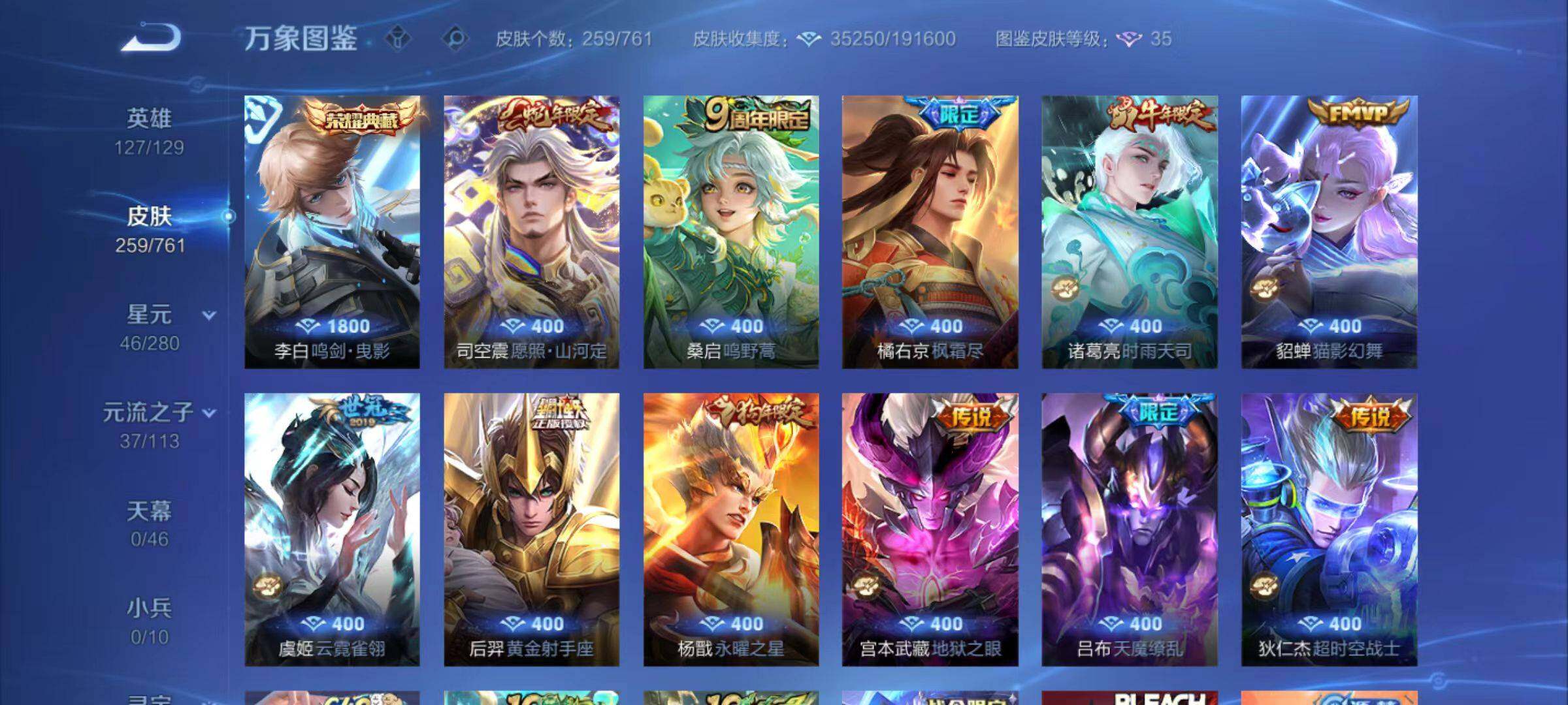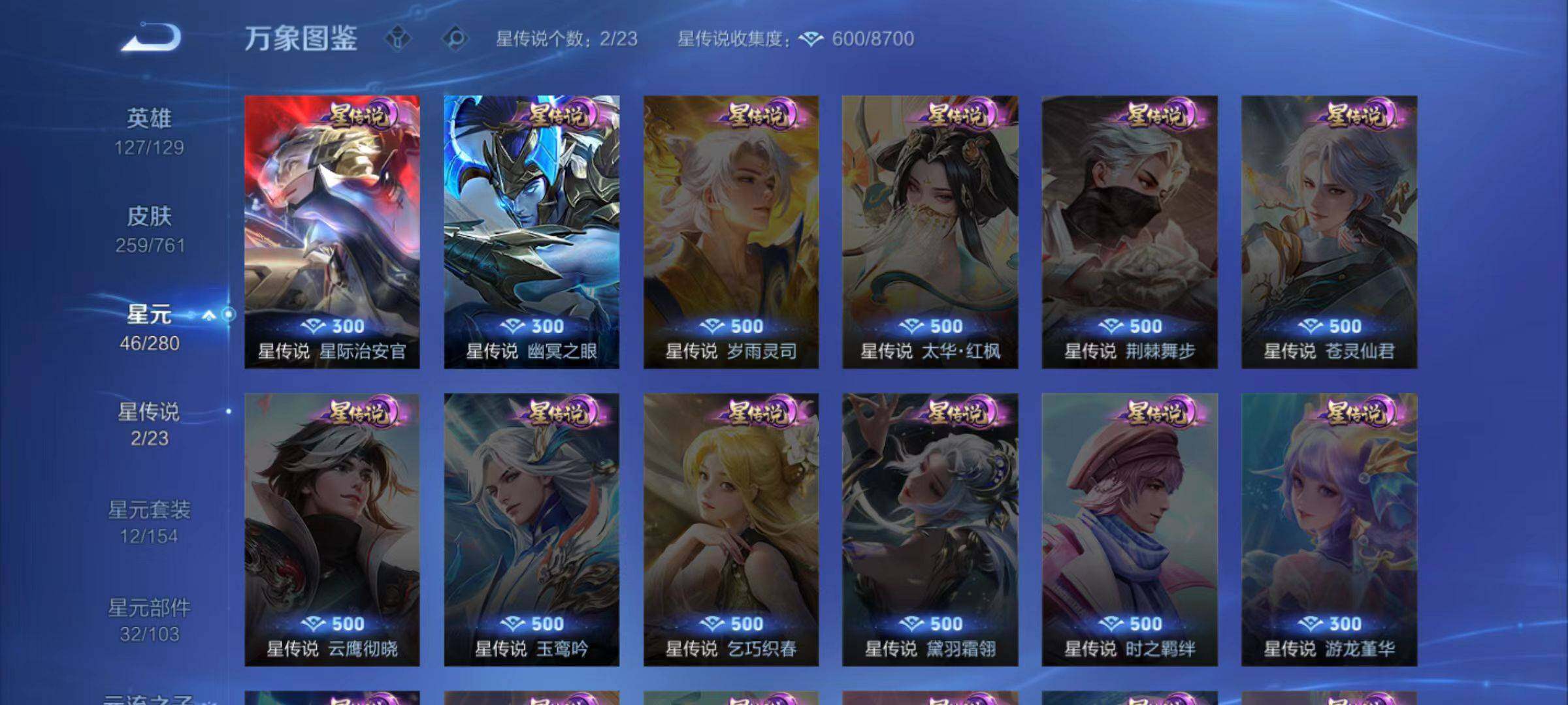 虞姬凯尔特女王,白起狰,太乙真人饕餮,曹操烛龙,芈月重明,典韦穷奇,狂铁御狮,米莱狄御霄,牛魔御旌,盾山御銮,夏侯惇朔风刀,明世隐疑决卦,老夫子醍醐杖,鬼谷子原初探秘者,狄仁杰万华元夜,程咬金演武夺筹,钟馗驱傩正仪,吕布猎兽之王,嬴政白昼王子,女娲朔望之晖,典韦蓝屏警告,钟馗神迹守卫,鲁班七号狮舞东方,刘邦夺宝奇兵,弈星混沌棋,沈梦溪大漠名商,李元芳云中旅人,桑启海盐诗旅,裴擒虎擒涛扼浪,鲁班大师探海日志,张良古海寻踪