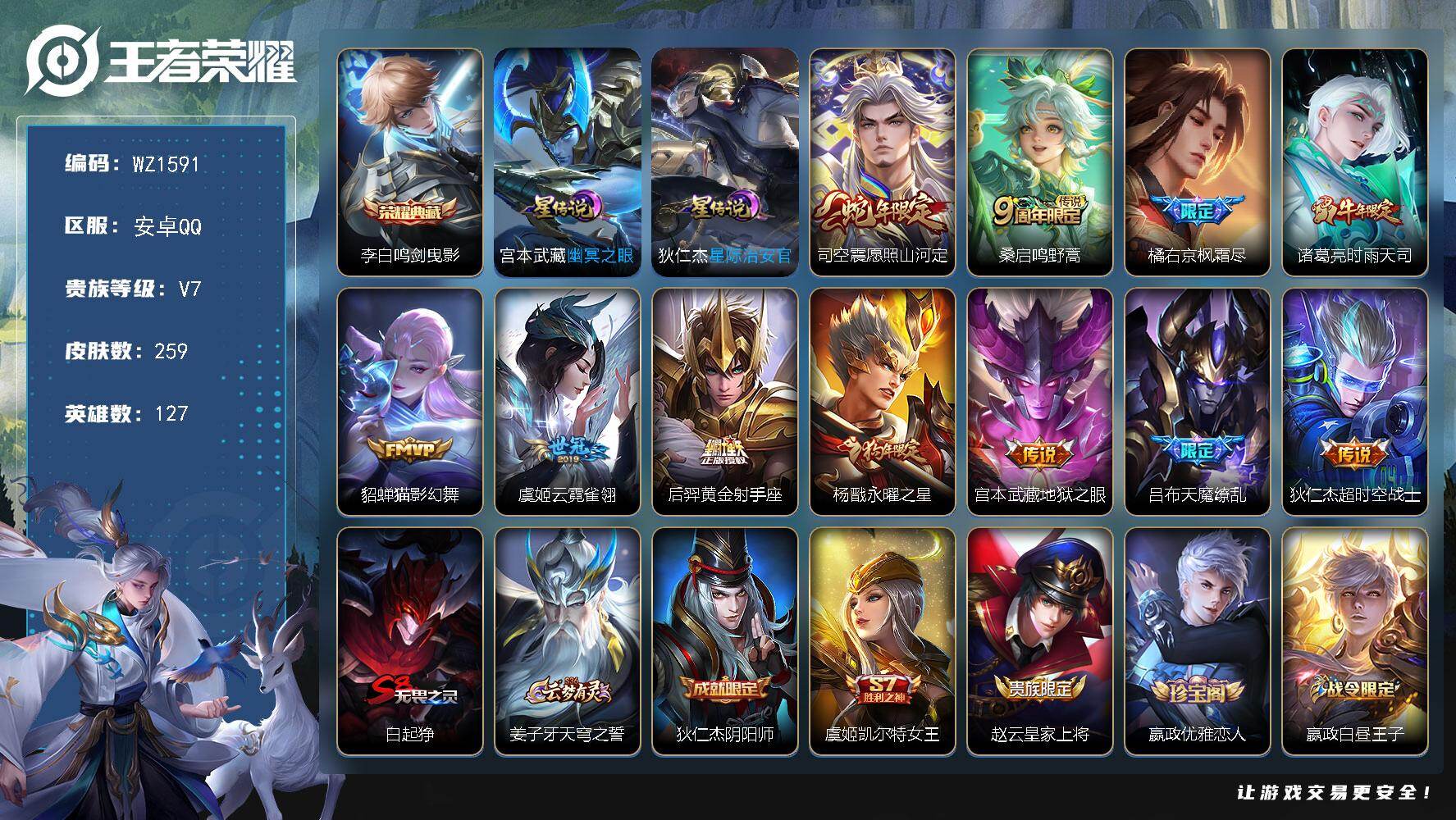 - [13496278]可二次【店主推荐捡漏号!可直接换绑,,】安卓Q-V7-最强王者段位-127英雄-303皮肤-2典藏-10传说-85史诗-1星元 【英雄全皮】:孙权全皮,戈娅全皮,空空儿全皮,影全皮,海诺全皮 【荣耀典藏】:李白鸣剑曳影,韩信弑枪猎影 【传说皮肤】:后羿神树通天,桑启鸣野蒿,澜逐花归海,孙悟空齐天大圣,镜炽阳神光,曜云鹰飞将,李信一念神魔,刘备时之恋人,张良黄金白羊座,宫本武藏地狱之眼 【限定皮肤】:蒙犽顽岩魄,蔡文姬夏日便利店,大乔绒语心约,虞姬夏日便利店,姜子牙天穹之誓,李白谪仙醉月,狄仁杰阴阳师,赵云皇家上将,孙尚香蔷薇恋人,钟无艳超时空战士,扁鹊奇幻香踪,周瑜赤莲之焰,元歌无心,夏侯惇朔风刀,甄姬落雪兰心,典韦岱宗,马可波罗暗影游猎,狄仁杰魔术师,狄仁杰万华元夜,达摩沙漠行僧,项羽海滩派对,老夫子醍醐杖,程咬金演武夺筹,韩信傲雪梅枪,王昭君午后时光,兰陵王金庭之子,孙悟空齐天大圣,李元芳匿光侦查者,李元芳云中旅人,钟馗驱傩正仪,杨戬潮玩骑兵,女娲朔望之晖,鬼谷子原初探秘者,鬼谷子五谷丰年,苏烈千军破阵,百里玄策原初追逐者,沈梦溪星空之诺,沈梦溪大漠名商,裴擒虎李小龙,裴擒虎擒涛扼浪,狂铁电玩高手,云中君纤云弄巧,嫦娥拒霜思,嫦娥暖冬兔眠,西施玲珑珍味,西施至美乘鲤谣,鲁班大师探海日志,桑启海盐诗旅,暃星界游侠,戈娅驭风魔法,艾琳流音漫舞,司空震地狱燃心,张良古海寻踪,蒙犽百解令,蒙恬荣光圣徽,高渐离燃音魔法,妲己灵卜魔法,鬼谷子天穹祈灯,伽罗琥珀纪元,姬小满妄想食味,沈梦溪龙舞盛年,鲁班七号蔬乡物语,李元芳蔬乡物语,刘邦剑破天穹,程咬金群星魔术团,镜青焰无极,项羽苍威无极,海诺心动手记,刘备异域游侠,芈月浮光幕影,周瑜熔金海岸 【年限皮肤】:典韦岱宗 【赛季限定】:夏侯惇朔风刀,狄仁杰万华元夜,达摩沙漠行僧,老夫子醍醐杖,程咬金演武夺筹,兰陵王金庭之子,张良古海寻踪,李元芳云中旅人,钟馗驱傩正仪,鬼谷子原初探秘者,苏烈千军破阵,百里玄策原初追逐者,沈梦溪大漠名商,裴擒虎擒涛扼浪,鲁班大师探海日志,桑启海盐诗旅,鬼谷子天穹祈灯,蒙恬荣光圣徽,刘邦剑破天穹,姜子牙天穹之誓 【战令限定】:蔡文姬夏日便利店,虞姬夏日便利店,钟无艳超时空战士,扁鹊奇幻香踪,周瑜赤莲之焰,甄姬落雪兰心,马可波罗暗影游猎,王昭君午后时光,艾琳流音漫舞,杨戬潮玩骑兵,女娲朔望之晖,沈梦溪星