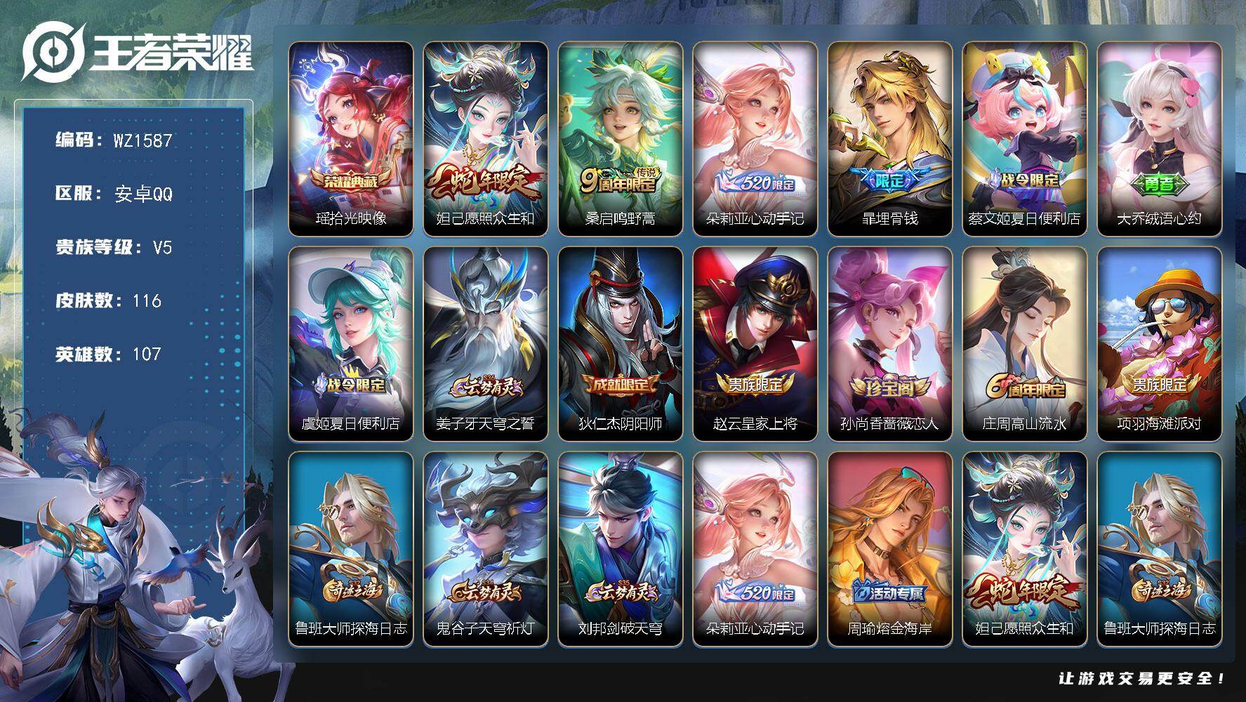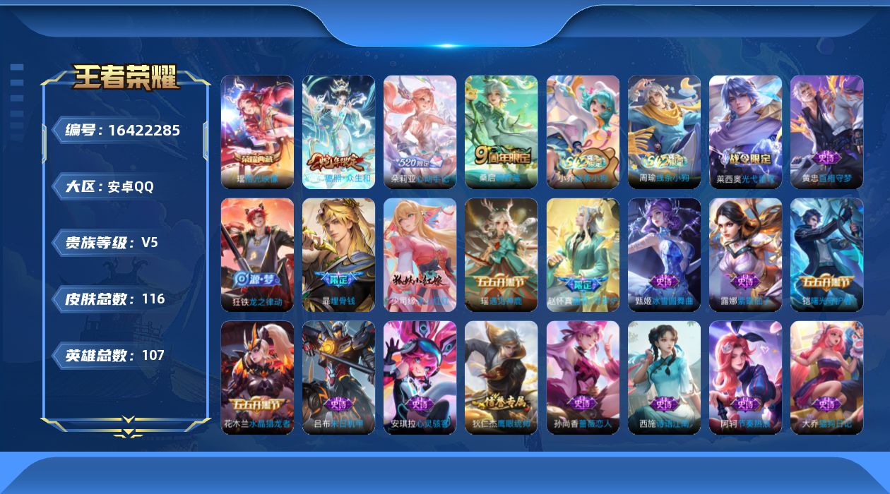 - [15390126]安卓Q-V7-最强王者段位-125英雄-256皮肤-1典藏皮肤-7传说-72史诗 【英雄全皮】:猪八戒全皮,蒙恬全皮 【荣耀典藏】:铠银白咏叹调 【传说皮肤】:后羿神树通天,澜逐花归海,公孙离祈雪灵祝,关羽武圣,李信一念神魔,干将莫邪久胜战神,孙尚香末日机甲 【限定皮肤】:白起狰,姜子牙天穹之誓,杨戬破阵退雄兵,狄仁杰阴阳师,虞姬凯尔特女王,赵云皇家上将,墨子神迹守卫,孙尚香蔷薇恋人,庄周蜃楼王,庄周高山流水,高渐离死亡摇滚,孙膑妖精王,扁鹊炼金王,芈月重明,芈月幻夜卜梦,元歌云间偶戏,夏侯惇朔风刀,甄姬游园惊梦,曹操烛龙,典韦穷奇,典韦蓝屏警告,马可波罗暗影游猎,狄仁杰魔术师,狄仁杰万华元夜,达摩星际陆战队,达摩沙漠行僧,项羽海滩派对,老夫子圣诞老人,老夫子醍醐杖,老夫子航海奇遇记,关羽冰锋战神,关羽武圣,程咬金演武夺筹,韩信逐梦之影,韩信傲雪梅枪,亚瑟狮心王,亚瑟潮玩骑士王,孙悟空至尊宝,孙悟空孙行者,牛魔御旌,后羿圣弓游侠,李元芳云中旅人,钟馗驱傩正仪,杨玉环遇见飞天,女娲朔望之晖,干将莫邪真爱魔法,雅典娜单词大作战,雅典娜黎明之约,蔡文姬繁星吟游,鬼谷子原初探秘者,鬼谷子五谷丰年,黄忠火炮绅士,苏烈千军破阵,百里玄策原初追逐者,弈星混沌棋,梦奇顽趣,公孙离祈雪灵祝,沈梦溪大漠名商,明世隐疑决卦,裴擒虎李小龙,裴擒虎擒涛扼浪,狂铁御狮,米莱狄御霄,米莱狄胡桃异想国,云中君纤云弄巧,盾山御銮,猪八戒西部大镖客,猪八戒猪悟能,上官婉儿梁祝,嫦娥拒霜思,蒙犽狂想玩偶喵,鲁班大师探海日志,镜匿光追影者,桑启海盐诗旅,艾琳女武神,阿古朵江河有灵,张良古海寻踪,蒙恬荣光圣徽,鬼谷子天穹祈灯,沈梦溪龙舞盛年,刘邦剑破天穹,程咬金群星魔术团,周瑜熔金海岸 【年限皮肤】:公孙离祈雪灵祝,马超神威,关羽武圣 【赛季限定】:庄周蜃楼王,孙膑妖精王,扁鹊炼金王,白起狰,芈月重明,夏侯惇朔风刀,曹操烛龙,典韦穷奇,狄仁杰万华元夜,达摩沙漠行僧,老夫子醍醐杖,程咬金演武夺筹,张良古海寻踪,亚瑟狮心王,牛魔御旌,李元芳云中旅人,虞姬凯尔特女王,钟馗驱傩正仪,雅典娜黎明之约,鬼谷子原初探秘者,苏烈千军破阵,百里玄策原初追逐者,弈星混沌棋,梦奇顽趣,沈梦溪大漠名商,明世隐疑决卦,裴擒虎擒涛扼浪,狂铁御狮,米莱狄御霄,盾山御銮,鲁班大师探海日志,桑启海盐诗旅,鬼谷子天穹祈灯,蒙恬荣光圣徽,刘邦