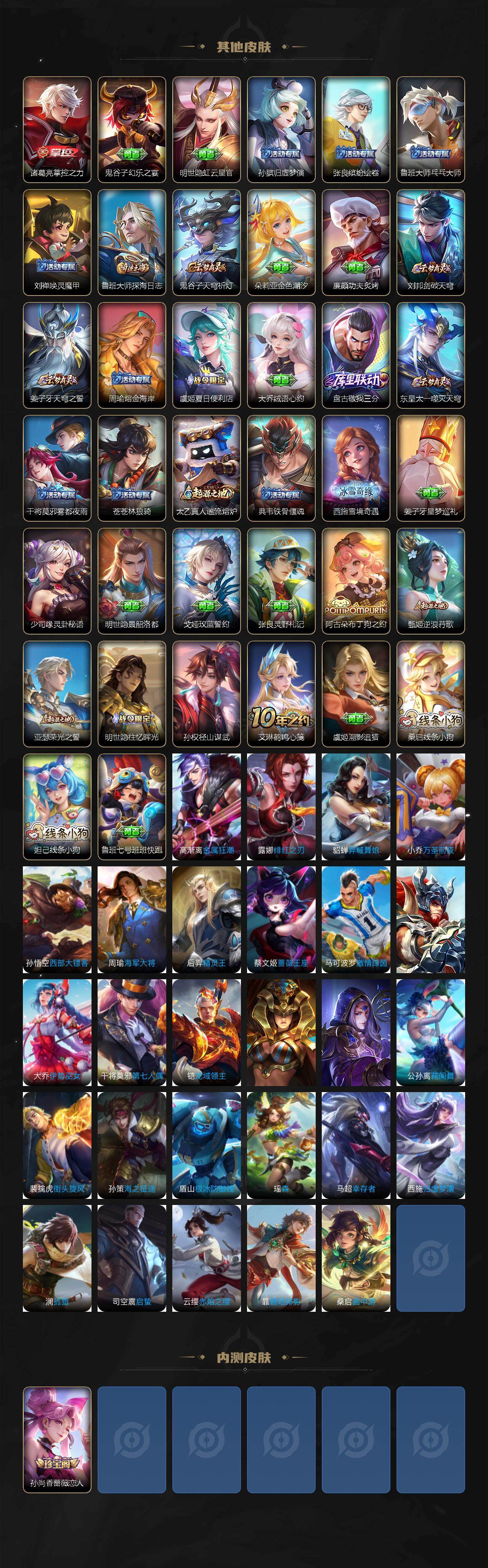 【其他皮肤】:项羽海滩派对,韩信街头霸王,芈月红桃皇后,牛魔西部大镖客,安琪拉玩偶对对碰,亚瑟死亡骑士,达摩拳王,花木兰兔女郎,后羿阿尔法小队,狄仁杰阴阳师,关羽龙腾万里,王昭君幻想奇妙夜,诸葛亮掌控之力,鬼谷子幻乐之宴,明世隐虹云星官,孙膑归虚梦演,张良缤纷绘卷,鲁班大师乓乓大师,刘禅唤灵魔甲,鲁班大师探海日志,鬼谷子天穹祈灯,朵莉亚金色潮汐,廉颇功夫炙烤,刘邦剑破天穹,姜子牙天穹之誓,周瑜熔金海岸,虞姬夏日便利店,大乔绒语心约,盘古敬我三分,东皇太一噬灭天穹,干将莫邪雾都夜雨,苍苍林狼骑,太乙真人谧流熔炉,典韦铁骨偃魂,西施雪境奇遇,姜子牙星梦巡礼,少司缘灵卦秘语,明世隐景韶洛都,戈娅玫蓝誓约,张良灵野札记,阿古朵布丁狗之约,甄姬逆浪荇歌,亚瑟荣光之誓,明世隐往忆晖光,孙权径山谋武,艾琳鹤鸣心笺,虞姬溯影追猎,桑启线条小狗,妲己线条小狗,鲁班七号班班快跑,高渐离金