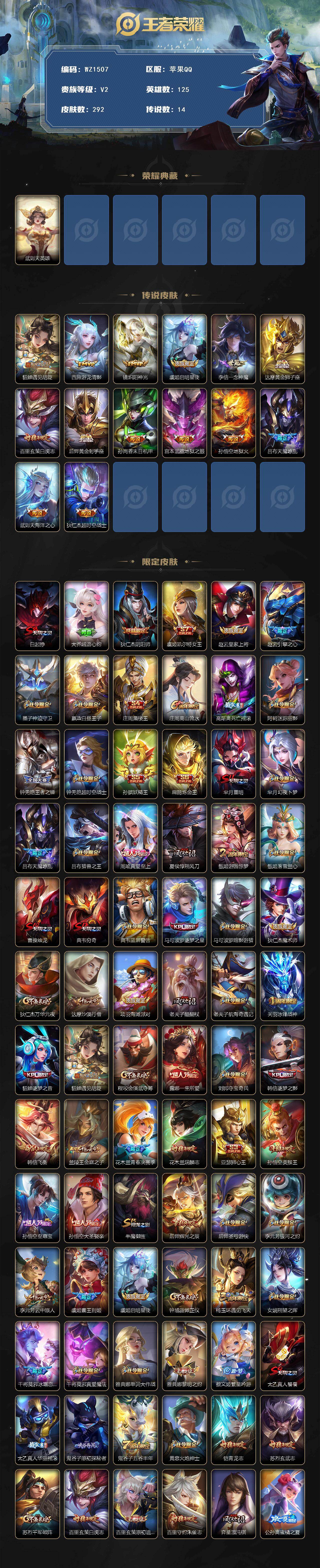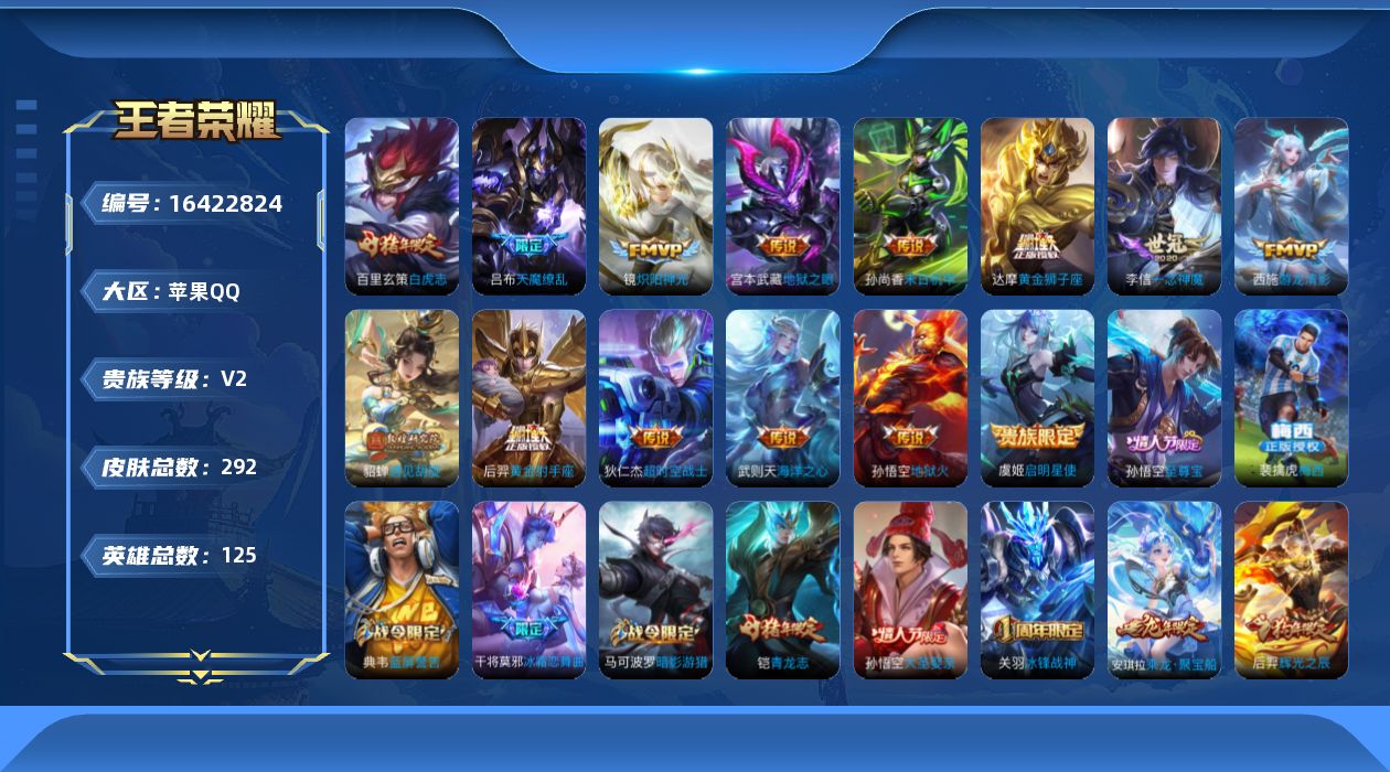 [16422824]苹果Q-V2-秩序白银II段位-125英雄-292皮肤-1典藏英雄-14传说-82史诗