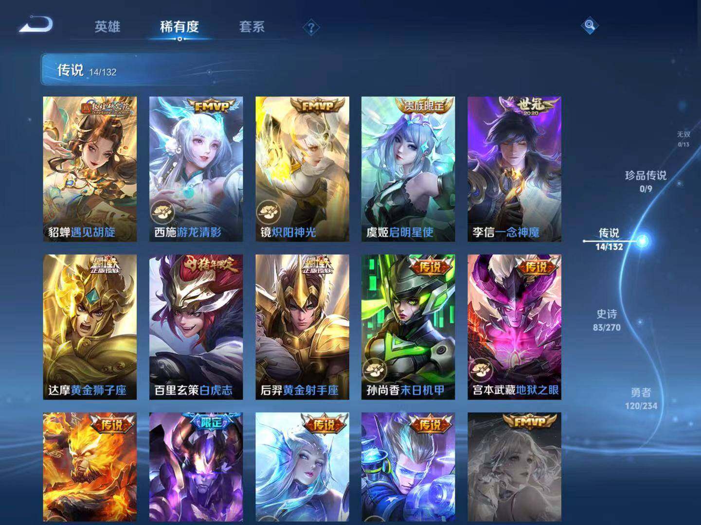 【传说皮肤】:貂蝉遇见胡旋,西施游龙清影,镜炽阳神光,虞姬启明星使,李信一念神魔,达摩黄金狮子座,百里玄策白虎志,后羿黄金射手座,孙尚香末日机甲,宫本武藏地狱之眼,孙悟空地狱火,吕布天魔缭乱,武则天海洋之心,狄仁杰超时空战士