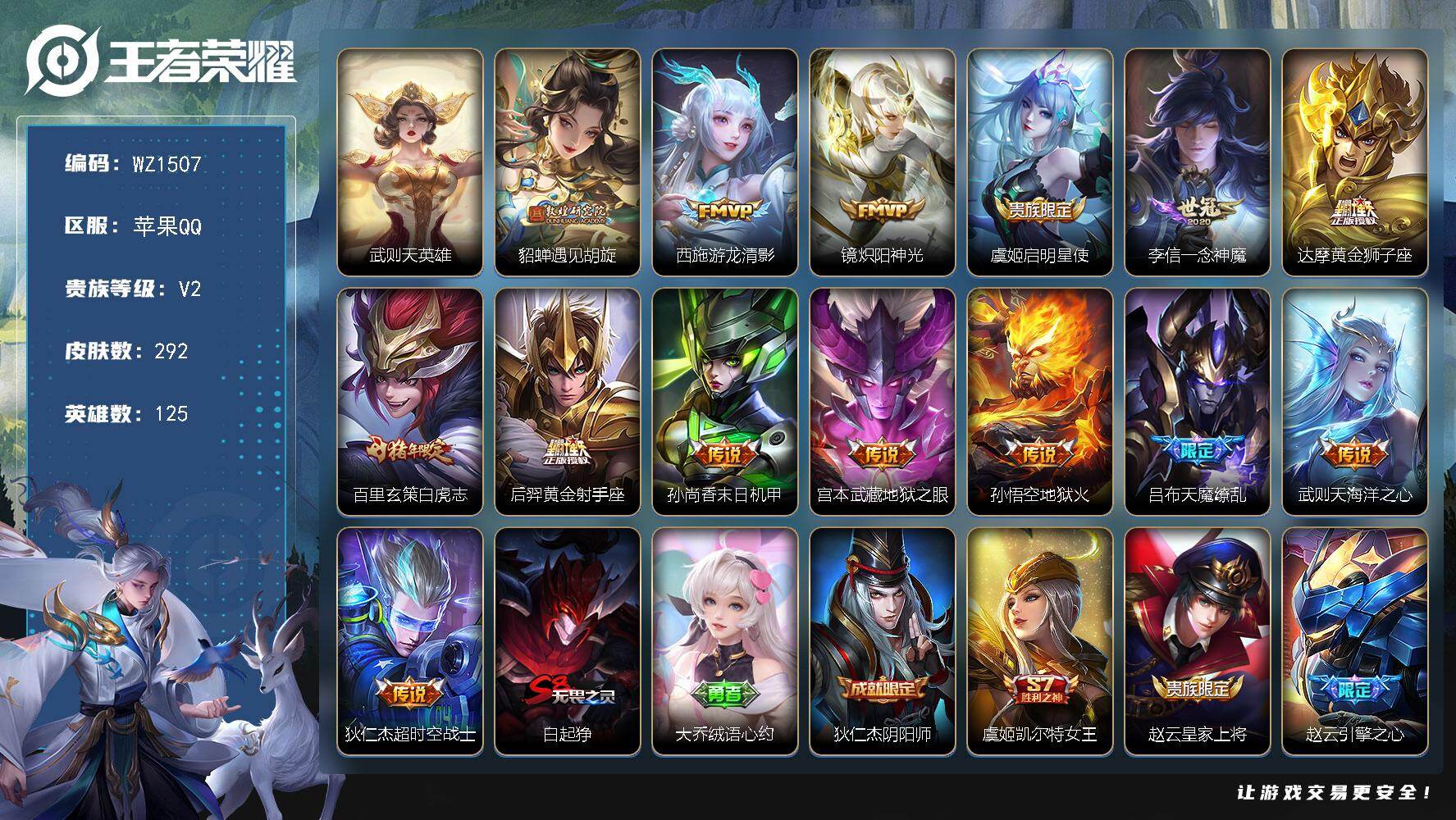 - [12118569]V9 2典藏 50传说 126英雄 395皮肤 典藏英雄武则天 女号 可修改实名 优质装备:杀手不太冷,幻阙歌(貂蝉典藏),黄金射手座,黄金白羊座,猫影幻舞,炽阳神光,一念神魔,云霓雀翎,末日机甲-孙尚香(绿蚂蚱),仲夏夜之梦(大飞蛾),零号·赤焰,海洋之心,地狱之眼,乞巧织情,游龙清影(小青龙),遇见胡旋,花朝如约(花篮子),挚爱之约,挚爱花嫁,音你闪耀(rap皮),山海·炽霜斩(李信年限),山海·琳琅生(小乔年限),山海·苍雷引(电光曜子),燃星之曲,浮生妄,遇见神鼓,鲁班七号-时之奇旅,大乔-时之奇旅,永恒水手月亮,黄金天蝎座,涂山容容 传说皮:乘龙·问璇玑(孙尚香年限),貂蝉曦玄引,星之鸣奏 珍宝阁皮:优雅恋人,蔷薇恋人,女武神 限定皮:愿照·众生和(妲己年限),愿照·千秋盛(女娲年限),鸣野蒿,凤凰于飞,太华(伽罗年限),武陵仙君(小桃花),异界灵契(白毛香),傲雪梅枪,补天,寅虎·展翼(孙膑年限),星穹之声,绯月行,时之彼端,白鹤梁神女,魔法小厨娘,白晶晶,时雨天司(水龙头),山海·碧波行(瑶年限),瑞麟志(木兰年限),至美·乘鲤谣,至美·化雀舞,遇见飞天,高山流水,匿光决锋者,五谷丰年,武圣,天狼运算者,游园惊梦,梁祝,天狼溯光者,逐梦之音,祈雪灵祝(雪兔子),天狼绘梦者,李小龙,霸王别姬-项羽,霸王别姬-虞姬,奇迹圣诞,默契交锋-花木兰,纯白花嫁,孙行者,猪悟能,一生所爱,青春决赛季,云端筑梦师,蜜橘之夏,热情桑巴,神奇女侠,匿光追影者,女儿国国王,寅虎·御盾(廉颇年限),寅虎·瑞焰(虎皮蛋子),寅虎·心曲(虎婆),寅虎·赤拳(老虎年限),时之祈愿-云中君,时之祈愿-瑶(瑶传限),百木心枪,玉兔公主,启示之音,深海之息(深海大菠萝),唐三藏,时之奇旅-妲己,神器·万象笔,梦圆繁星,山海·玄木吟(马可年限) 史诗皮:乘龙·忆丹青(大乔年限),遇见神鹿,紫霞仙子,电玩小子(小书包),白龙吟,特工魅影,千年之狐,永昼,江河有灵,魅语,百解令(蒙犽),高渐离燃音魔法,蒙恬荣光圣徽,无限星赏官,冰冠公主,青蛇,偶像歌手,白蛇,电玩·爆裂旋风,暗夜猫娘,银翎春语,龙骑士(小龙虾),猫狗日记-孙策,猫狗日记-大乔,时之恋人-孙尚香,乱世虎臣,节奏热浪,女仆咖啡,摇滚巨星,水果甜心,绅士熊喵,天才门将,星夜王子,心灵骇客,时之奇旅-安琪拉,功夫厨神,