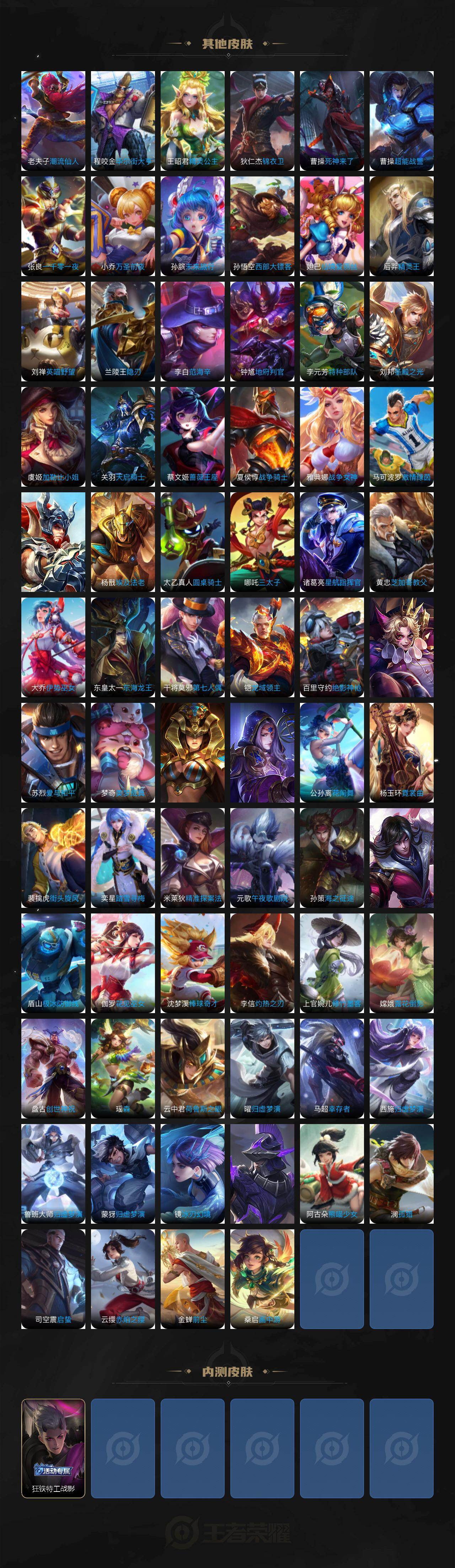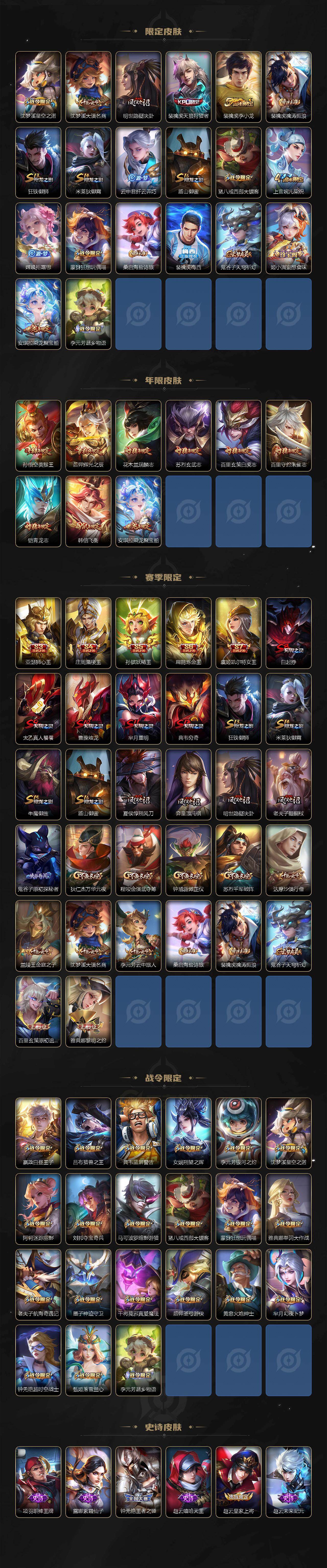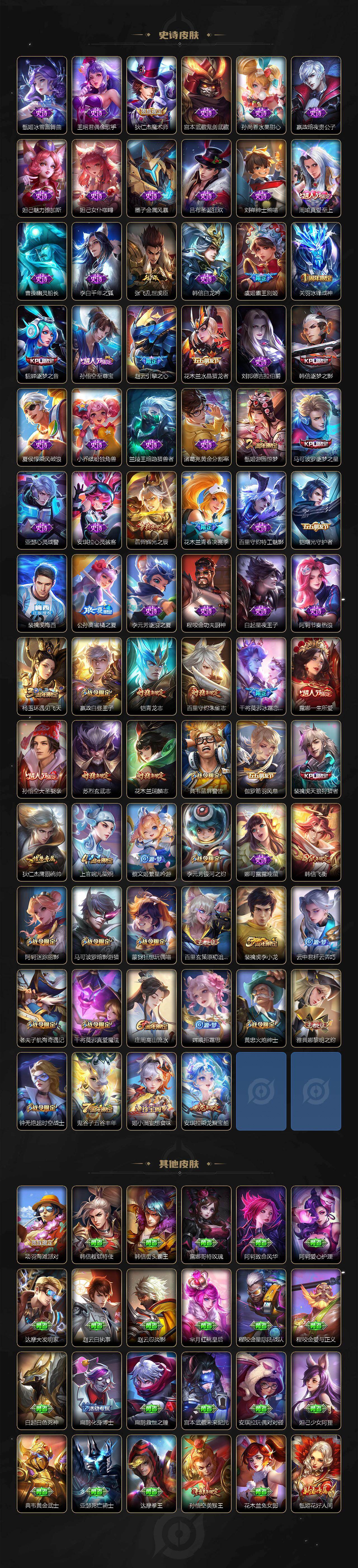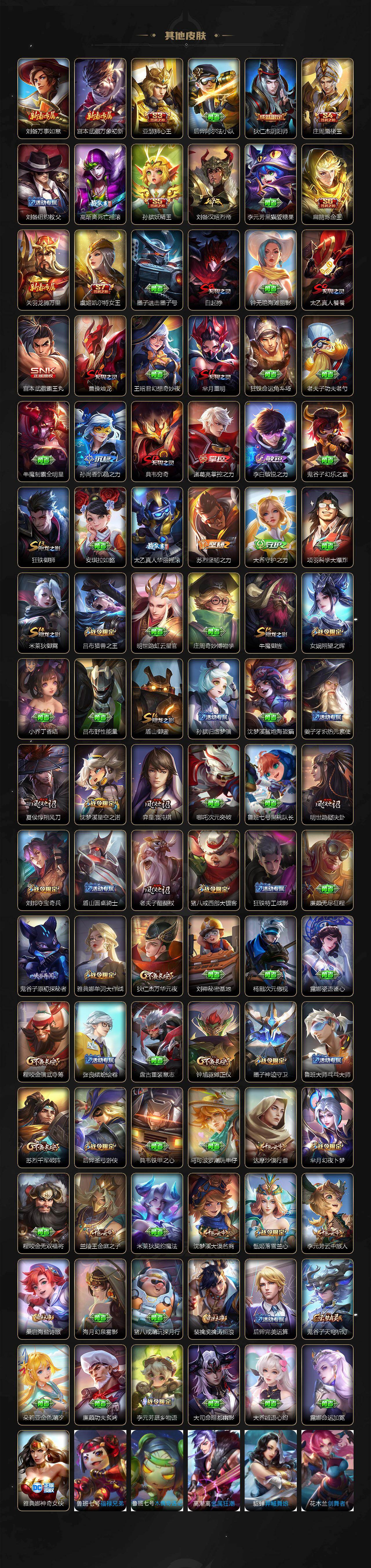 【限定皮肤】:白起狰,大乔绒语心约,狄仁杰阴阳师,虞姬凯尔特女王,赵云皇家上将,赵云引擎之心,墨子神迹守卫,嬴政白昼王子,庄周蜃楼王,庄周高山流水,高渐离死亡摇滚,阿轲迷踪丽影,钟无艳王者之锤,钟无艳超时空战士,孙膑妖精王,扁鹊炼金王,芈月重明,芈月幻夜卜梦,吕布天魔缭乱,吕布猎兽之王,周瑜真爱至上,夏侯惇朔风刀,甄姬游园惊梦,甄姬落雪兰心,曹操烛龙,典韦穷奇,典韦蓝屏警告,马可波罗逐梦之星,马可波罗暗影游猎,狄仁杰魔术师,狄仁杰万华元夜,达摩沙漠行僧,项羽海滩派对,老夫子醍醐杖,老夫子航海奇遇记,关羽冰锋战神,貂蝉逐梦之音,貂蝉遇见胡旋,程咬金演武夺筹,露娜一生所爱,刘邦夺宝奇兵,韩信逐梦之影,韩信飞衡,兰陵王金庭之子,花木兰青春决赛季,花木兰瑞麟志,亚瑟狮心王,孙悟空美猴王,孙悟空至尊宝,孙悟空大圣娶亲,牛魔御旌,后羿辉光之辰,后羿圣弓游侠,李元芳银河之约,李元芳云中旅人,虞姬霸王别姬,虞姬启明星使,钟馗驱傩正仪,杨玉环遇见飞天,女娲朔望之晖,干将莫邪冰霜恋舞曲,干将莫邪真爱魔法,雅典娜单词大作战,雅典娜黎明之约,蔡文姬繁星吟游,太乙真人饕餮,太乙真人华丽摇滚,鬼谷子原初探秘者,鬼谷子五谷丰年,黄忠火炮绅士,铠青龙志,苏烈玄武志,苏烈千军破阵,百里玄策白虎志,百里玄策原初追逐者,百里守约朱雀志,弈星混沌棋,公孙离蜜橘之夏,沈梦溪星空之诺,沈梦溪大漠名商,明世隐疑决卦,裴擒虎天狼狩猎者,裴擒虎李小龙,裴擒虎擒涛扼浪,狂铁御狮,米莱狄御霄,云中君纤云弄巧,盾山御銮,猪八戒西部大镖客,上官婉儿梁祝,嫦娥拒霜思,蒙犽狂想玩偶喵,桑启海盐诗旅,裴擒虎梅西,鬼谷子天穹祈灯,姬小满妄想食味,安琪拉乘龙聚宝船,李元芳蔬乡物语