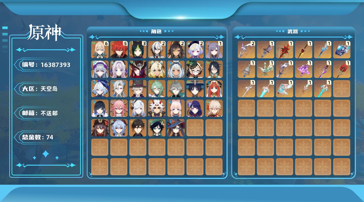 [16387393]60级/74黄/男主/34个五星角色/18个五星武器