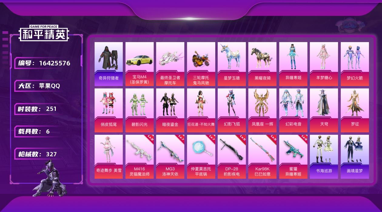 [16425576]苹果 手Q-1神装-14粉装-9特效枪-6载具-8粉色飞行器-124974热力值-19王牌印记-251套装-327枪皮【红色神装等级】:暮色玫影-艾丽娅(二级)【红色角色神装】:暮色玫影-艾丽娅