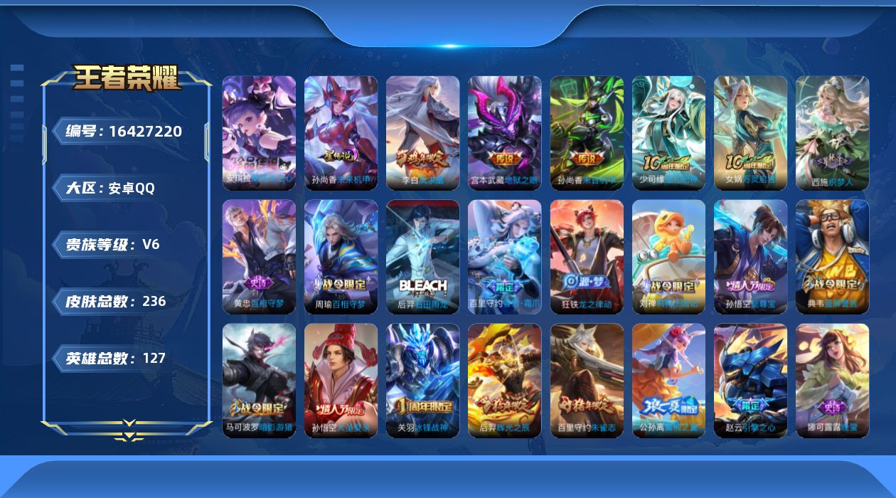 [16427220]【特价急出/详情看图】安卓Q-V6-最强王者段位-127英雄-236皮肤-1珍品传说-1星元-4传说-72史诗