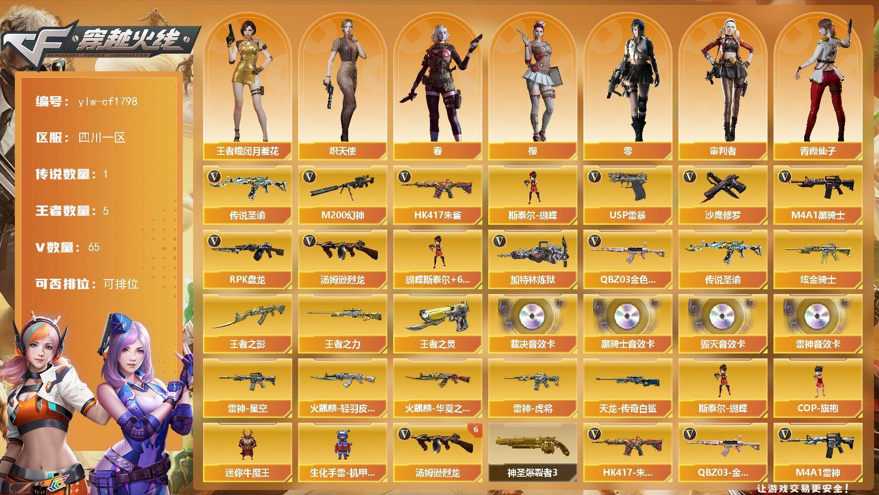 [16429309]四川一区-65V-5王者-1炫金 【传说武器】:传说圣谕 【热门武器】:传说圣谕,QBZ03-金色蔷薇,HK417-朱雀*2,M200-幻神,M4A1-黑骑士*3,汤姆逊-烈龙*6,RPK-盘龙*4,加特林-炼狱,斯泰尔-蝴蝶,USP-雷暴,沙鹰-修罗*2 【王者炫金武器】:炫金骑士,王者之影,王者之力,王者之灵 【音效卡】:M4A1-雷神音效卡,M4A1-黑骑士音效卡,Barrett-毁灭音效卡,AWM-裁决音效卡 【稀有皮肤】:雷神-星空,雷神-虎将,火麒麟-华夏之心,火麒麟-轻羽皮肤,AWM-天龙-传奇白鲨,AWM-CFS 2020 【角色】:王者-瞳-闭月羞花,零,樱,春,炽天使,审判者,新灵狐者,青霞仙子 【人偶武器】:斯泰尔-蝴蝶,COP-旗袍,迷你牛魔王,生化手雷-机甲核心 【暴走生化】:斯泰尔-蝴蝶 【挑战大师】:神圣爆裂者III 【英雄级武器】:AK47-雷暴,USP-雷暴,斩神刀-雷暴,QBZ03-金色蔷薇,HK417-朱雀*2,M4A1-雷神*2,M4A1-黑骑士*3,RPK-盘龙*4,加特林-炼狱,汤姆逊-烈龙*6,AK47-火麒麟*3,AK12-天启*2,AWM-天龙,Barrett-毁灭,AWM-裁决,M4A1-龙血,M200-幻神,M4A1-千变,沙鹰-修罗*2,屠龙 【特殊枪械】:蝴蝶斯泰尔+6烈龙,3黑骑士,6烈龙,4盘龙,1炼狱,1蝴蝶斯泰尔