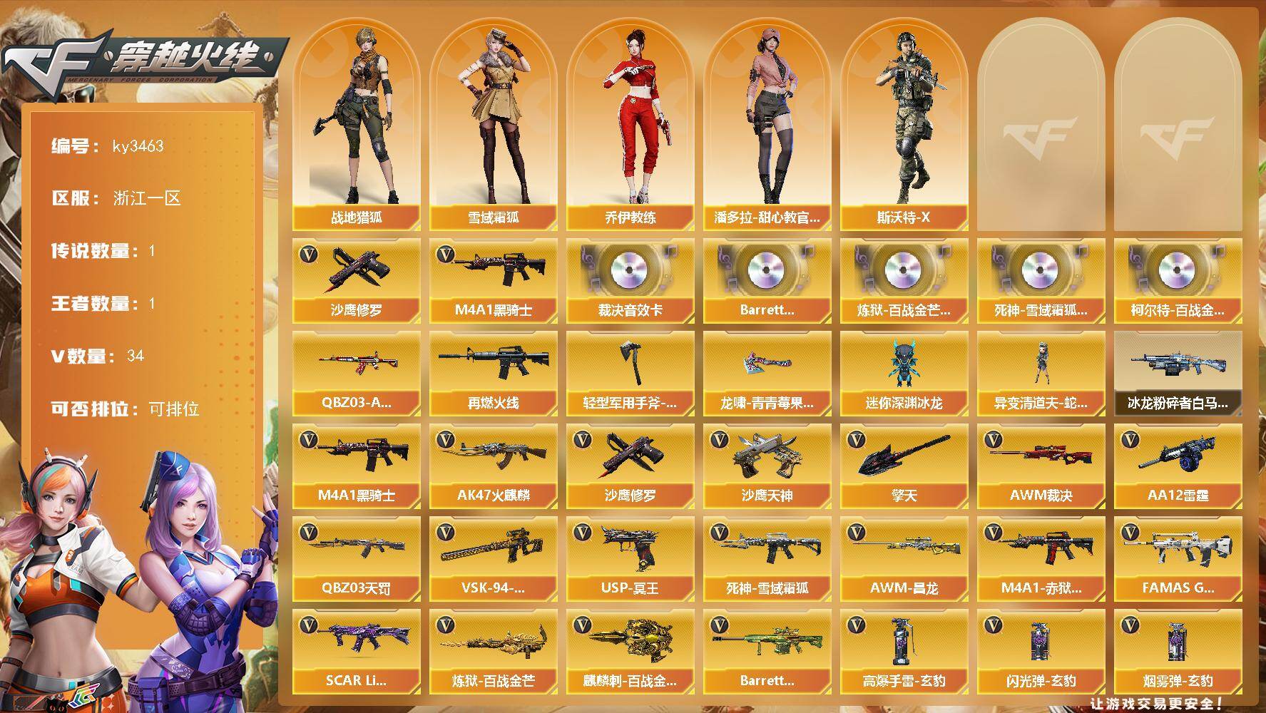 [16429696]浙江一区-34V-1王者-0炫金 【传说角色】:传说星骇 【热门武器】:M4A1-黑骑士,沙鹰-修罗 【音效卡】:AWM-裁决音效卡,Barrett-碧霄极光音效卡,炼狱-百战金芒-庆典舞曲音效卡,死神-雪域霜狐-怀旧音效卡,柯尔特-百战金芒-庆典舞曲音效卡 【皮肤】:QBZ03-AG-CFPLS19冠军,M4A1-再燃火线,轻型军用手斧-再燃火线,龙啸-青青莓果 皮肤 【角色】:战地猎狐,雪域霜狐,乔伊教练,潘多拉-甜心教官,斯沃特-X 【人偶武器】:异变清道夫-蛇影双骄,迷你深渊冰龙 【挑战大师】:冰龙粉碎者-白马银枪 【英雄级武器】:AK47-火麒麟,M4A1-黑骑士,QBZ03-天罚,FAMAS G2-天戎,死神-雪域霜狐,SCAR Light-玄豹,AWM-裁决,VSK-94-金蚀,炼狱-百战金芒,AA-12-雷霆,沙鹰-修罗,沙鹰-天神*2,Anaconda-玄豹,USP-冥王,擎天,麒麟刺-百战金芒,丛林匕首-玄豹*2,高爆手雷-玄豹*3,闪光弹-玄豹*3,烟雾弹-玄豹*2,M4A1-赤狱骑士,AWM-昌龙,Barrett-碧霄极光 【道具】:BS战队炫彩背包,云山科技背包,亚洲杯纪念炫彩背包,女皇终结者-背包,百战金芒炫彩背包,超级背包,雪域霜狐炫彩背包,女皇终结者-魔龙之吻,救世主-黑桃战神,绿色巨人,灵魂忍者,迷雾幽灵,夺命之镰,防化服*3,流光-再燃火线,语音特效-盛典烟火,语音特效-怀旧,雪域霜狐表情,萌萌小葵表情,防弹头盔*3,防弹衣*3,C4工具钳*3,手雷包*3 【特殊枪械】:1黑骑士