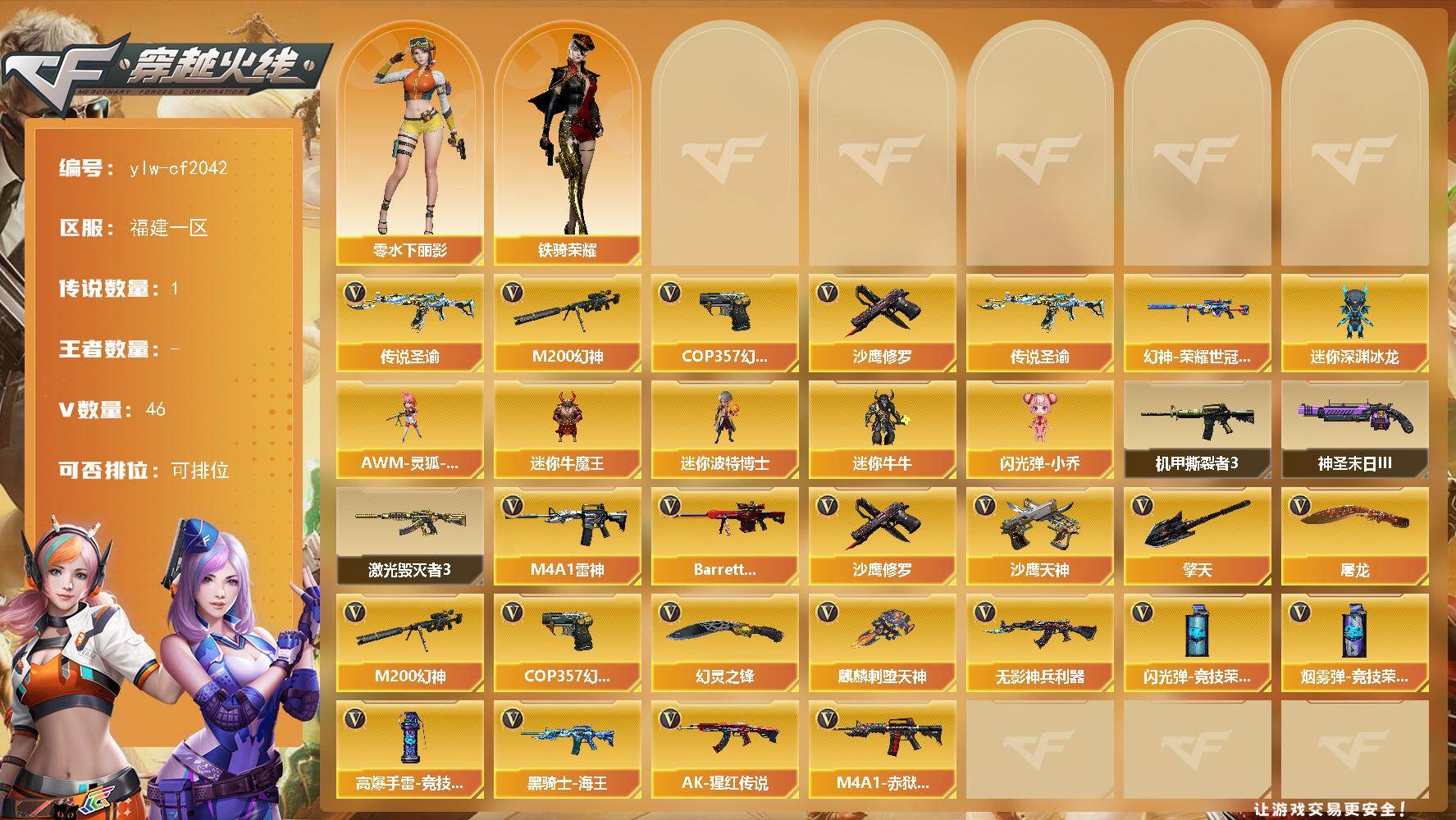 [16429924]福建一区-46V-0王者-0炫金 【传说武器】:传说圣谕 【热门武器】:传说圣谕,M200-幻神,COP 357-幻灵,沙鹰-修罗 【稀有皮肤】:M200-幻神-荣耀世冠白鲨,M200-庆典-CFS 2021,AWM-CFS 2020 【角色】:零-水下丽影,铁骑荣耀 【人偶武器】:AWM-灵狐-15周年嘉年华,迷你深渊冰龙,迷你牛魔王,迷你波特博士,迷你牛牛,闪光弹-小乔 【挑战大师】:机甲撕裂者III,神圣爆裂者-末日III,激光毁灭者III 【英雄级武器】:高爆手雷-竞技荣光,烟雾弹-竞技荣光,闪光弹-竞技荣光,COP 357-幻灵,幻灵之锋*3,麒麟刺-堕天神,无影-神兵利器,M4A1-雷神*2,Barrett-极光,M200-幻神,黑骑士-海王,AK-47-猩红传说*2,M4A1-赤狱骑士,沙鹰-天神,沙鹰-修罗,擎天,屠龙 【特殊枪械】: