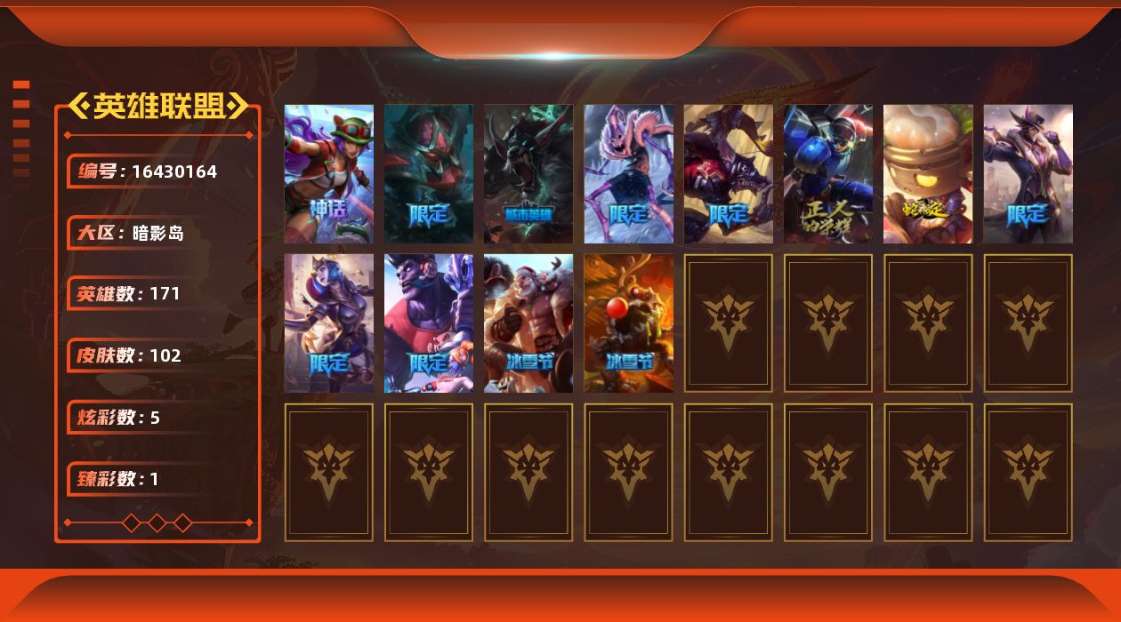 [16430164]【特价出售/店主推荐】未定级段位-171英雄-102皮肤-5炫彩-0终极-1神话-13限定-7传说-25史诗
