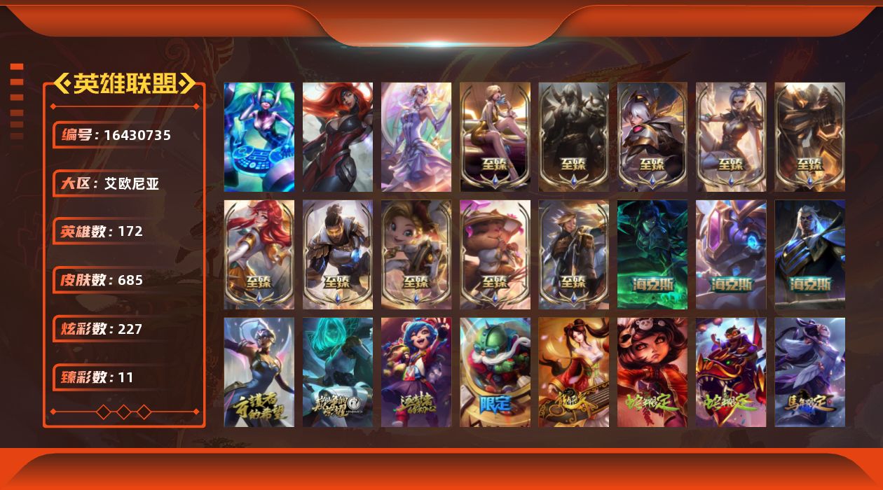 未定级段位-172英雄-685皮肤-227炫彩-3终极-16神话-143限定-58传说-174史诗