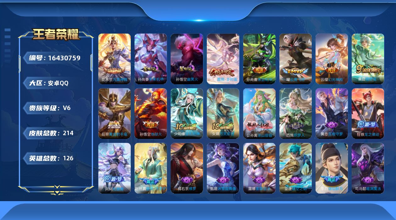 [16430759]【特价急出/详情看图】安卓Q-V6-尊贵铂金II段位-126英雄-214皮肤-1典藏皮肤-2星元-8传说-57史诗