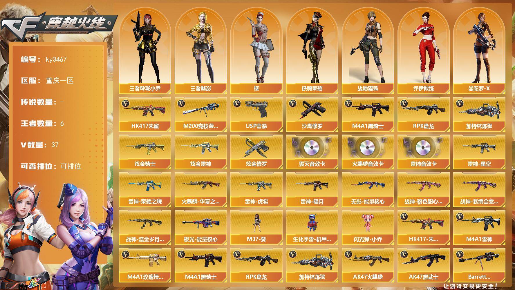 [16430876]重庆一区-37V-6王者-3炫金 【热门武器】:HK417-朱雀,M200-竞技荣光,M4A1-黑骑士*2,RPK-盘龙,加特林-炼狱,USP-雷暴,沙鹰-修罗 【王者炫金武器】:炫金骑士,炫金雷神,炫金修罗 【音效卡】:AK47-火麒麟音效卡,M4A1-雷神音效卡,Barrett-毁灭音效卡 【皮肤】:雷神-暗月,雷神-荣耀之魄,雷神-星空,雷神-虎将,火麒麟-华夏之心,无影-能量核心*2,战神-粉色甜心皮肤*3,战神-紫绶金章皮肤*2,战神-流金岁月皮肤*3,极光-能量核心 【角色】:樱,战地猎狐,王者-魅影,王者玲珑-小乔,乔伊教练,曼陀罗-X,潘多拉-X,潜龙队-X,铁骑荣耀,影武者-X 【人偶武器】:M37-葵,生化手雷-机甲核心,闪光弹-小乔 【英雄级武器】:AK47-火麒麟*2,M4A1-雷神*2,M4A1-黑骑士*2,AK47-黑武士*3,HK417-朱雀,M4A1-玫瑰精灵,王者之魄-觉醒版,王者之戮-觉醒版,超新星-悦享-觉醒版,AK-47-猩红传说*5,AK47-B-战神,Barrett-毁灭,AWM-裁决*2,M200-竞技荣光,RPK-盘龙,加特林-炼狱,沙鹰-修罗,USP-雷暴,柯尔特-竞技荣光,王者之锋-觉醒版,高爆手雷-竞技荣光*4,闪光弹-竞技荣光,烟雾弹-竞技荣光,M4A1-赤狱骑士 【道具】:炫彩背包,超级背包,女皇终结者-魔龙之吻,救世主-黑桃战神,绿色巨人,生化弹匣,夺命之镰,防化服*2,防弹头盔*4,防弹衣*2,C4工具钳*2,手雷包*3 【特殊枪械】:2黑骑士,1盘龙,1炼狱