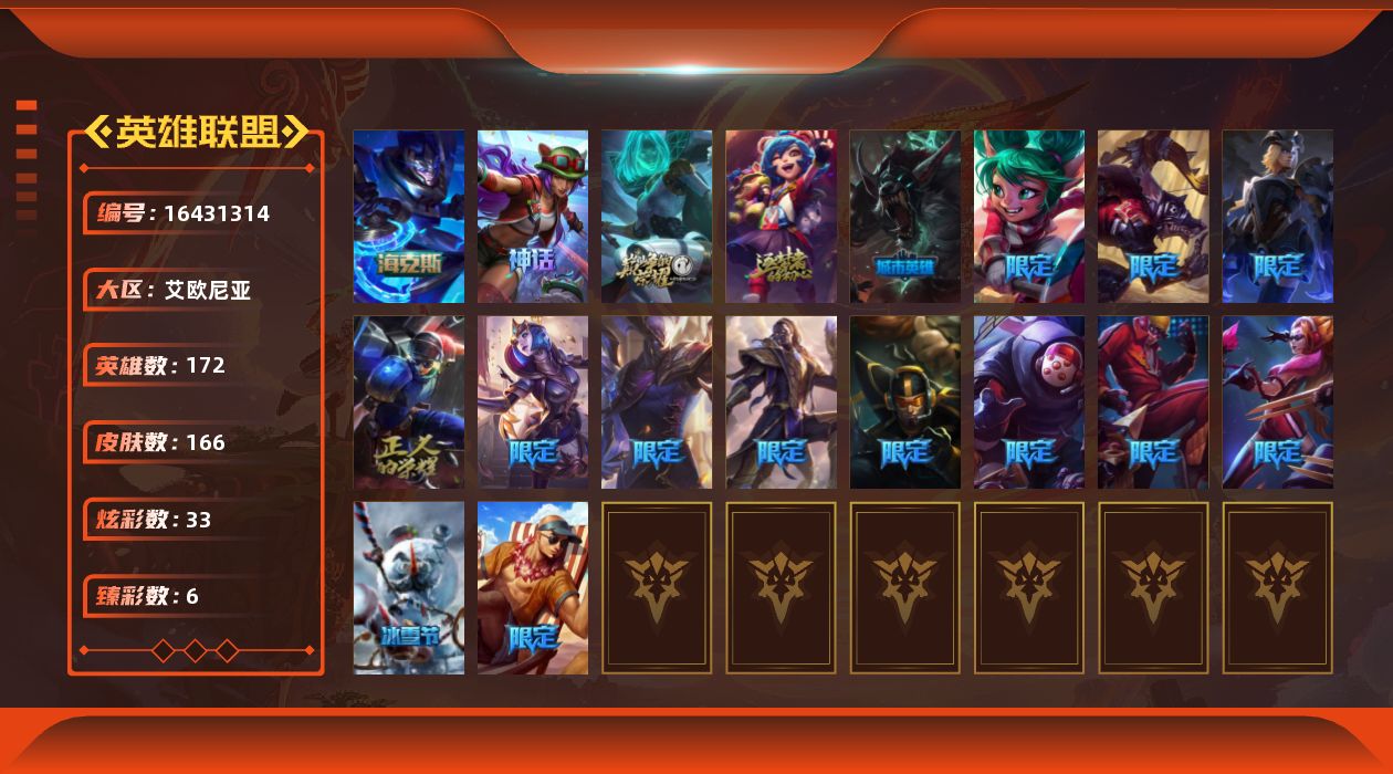 [16431314]【特价出售/店主推荐】未定级段位-172英雄-166皮肤-33炫彩-0终极-4神话-20限定-11传说-35史诗