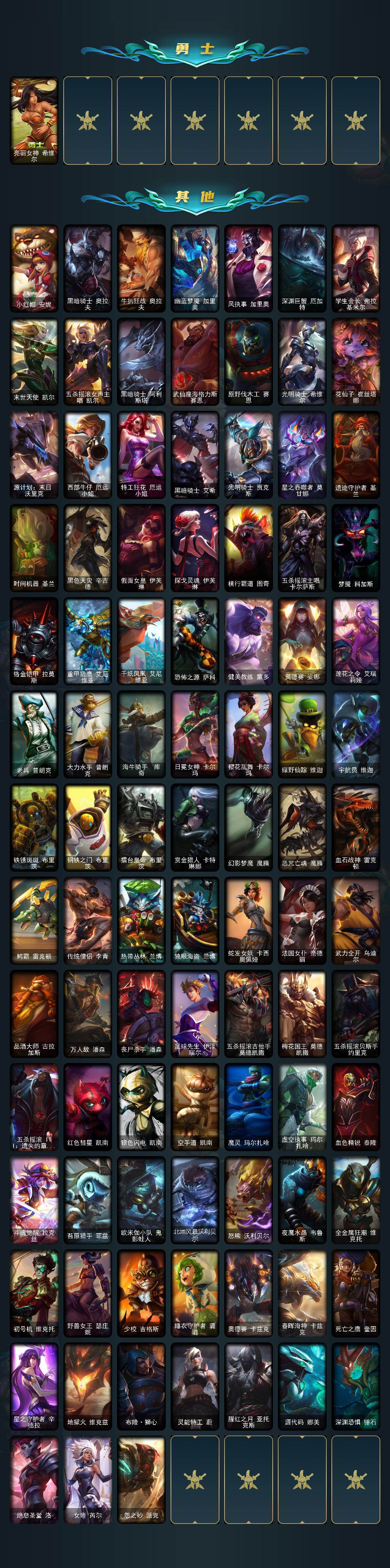 【其他皮肤1】:小红帽安妮,黑暗骑士奥拉夫,牛扒狂战奥拉夫,幽蓝梦魇加里奥,风执事加里奥,深渊巨蟹厄加特,学生会长弗拉基米尔,末世天使凯尔,五杀摇滚女声主唱凯尔,黑暗骑士阿利斯塔,武仙座海格力斯赛恩,原野伐木工赛恩,光明骑士希维尔,花仙子崔丝塔娜,源计划末日沃里克,西部牛仔厄运小姐,特工狂花厄运小姐,黑暗骑士艾希,光明骑士贾克斯,星之吞噬者莫甘娜,遗迹守护者基兰,时间机器基兰,黑色天灾辛吉德,假面女皇伊芙琳,探戈灵魂伊芙琳,横行霸道图奇,五杀摇滚主唱卡尔萨斯,梦魇科加