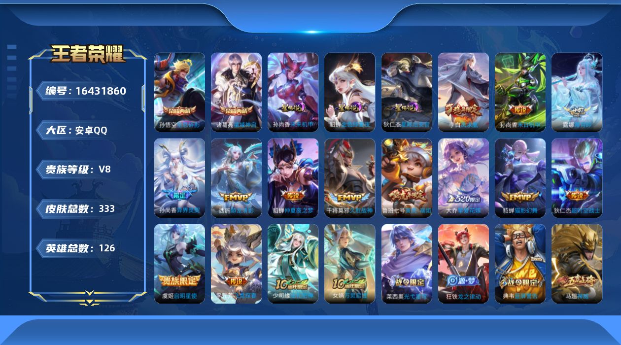 [16431860]【特价急出/详情看图】安卓Q-V8-最强王者段位-126英雄-333皮肤-2典藏皮肤-3星元-14传说-99史诗